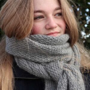 The shawl is knitted in Lang Yarns Suri Alpaca, a luxurious 100% alpaca yarn with an exceptionally soft halo. Each 25 g ball contains 100 m, giving a running length of 100 m per 25 g. The design requires 1200 m, equivalent to 12 balls of Suri Alpaca . The result is a lightweight yet warm fabric that highlights every cable twist.