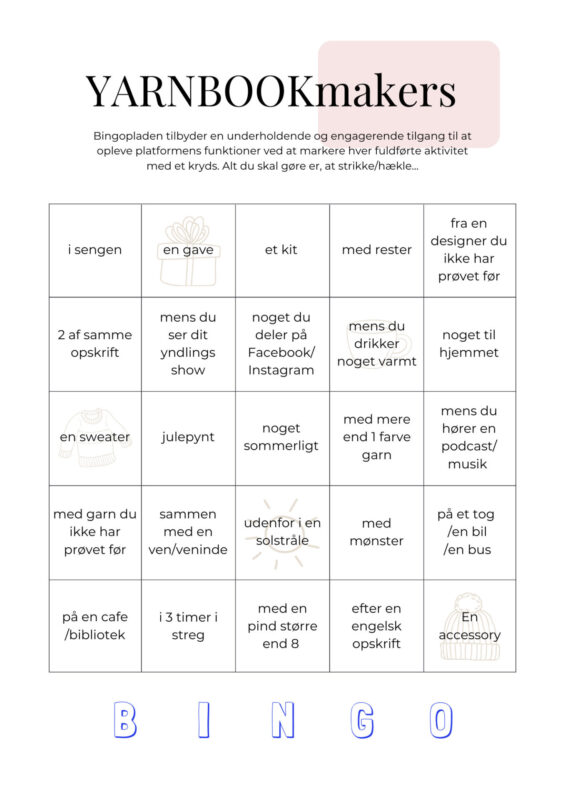 Ved at dykke ned i bingopladen opfordrer vi dig til at udforske nye hjørner af YARNBOOK, eksperimentere med nye omgivelser, garn og opskrifter, og selvfølgelig, at udvide dine kreative horisonter. Hver brik på pladen repræsenterer en unik og hyggelig udfordring.