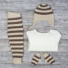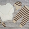 Buksen strikkes i to farver med 7 omgange per stribe, og har en kile mellem benene samt forhøjning bagtil, som giver en god pasform til blebørn og småbørn.