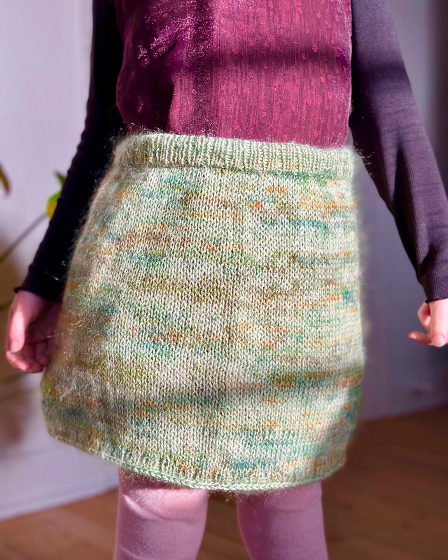 Aeris Skirt Junior (latinsk: ”luft” nederdel junior) af Knitlidt er en enkel, luftig og hurtigt strikket nederdel. Nederdelen er strikket i strømpegarn og mohair, som gør nederdelen slidstærk og derfor let anvendelig i hverdagen. Nederdel strikkes rundt, oppefra og ned og er strikket med tyskervendinger, som gør nederdelen en anelse længere og bagpå. Længden kan justeres efter behov og strikkes længere/kortere. Nederdelen på billedet er str. 5-6 år og strikket i Jawoll og Kid Color fra Lang Yarns i farverne 83.0191 og 1079.0008. Der bruges en pind 4 og 5.