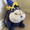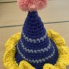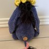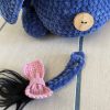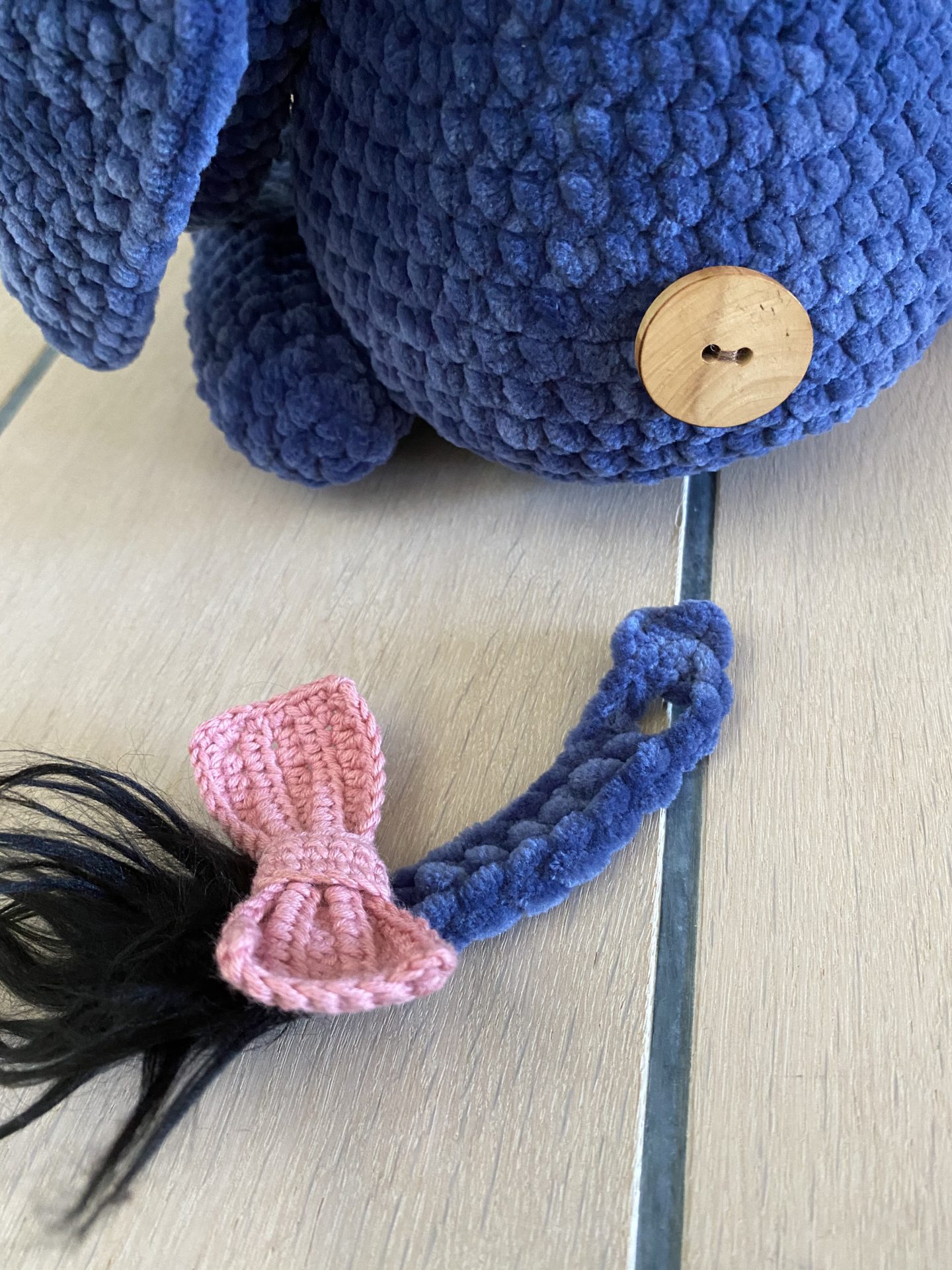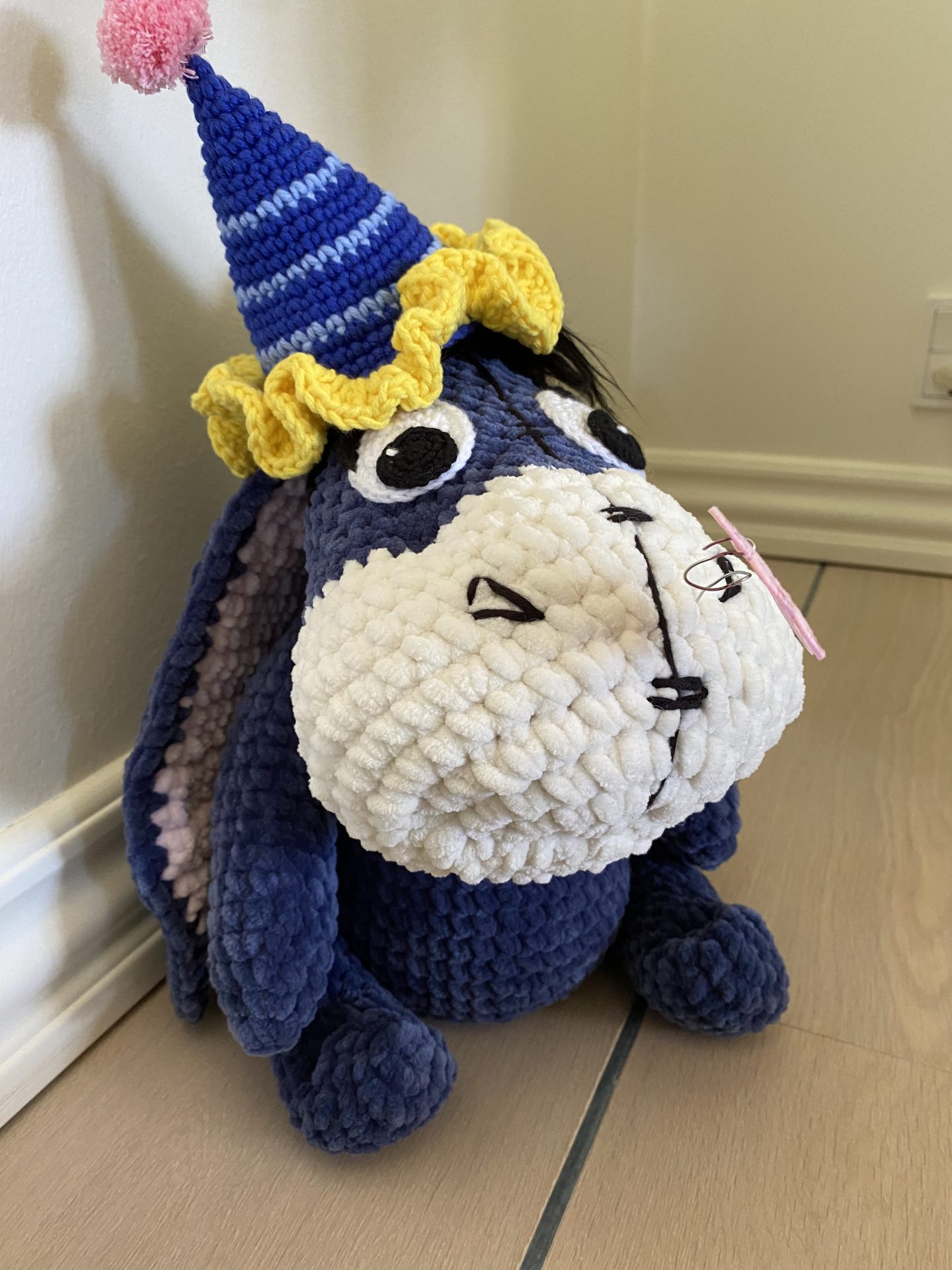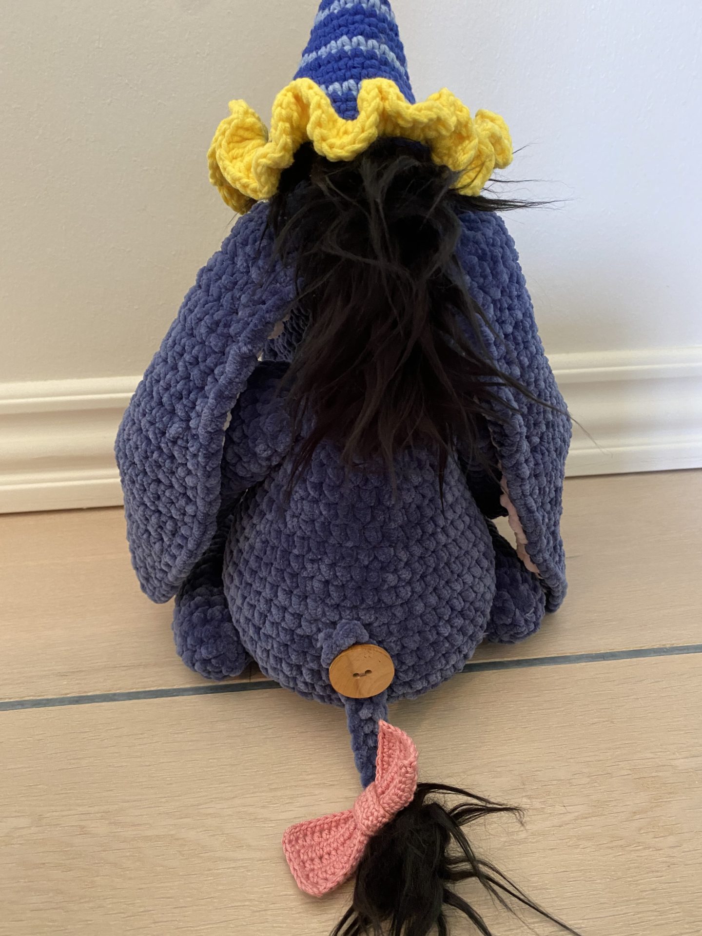 Dette Æsel måler ca. 28 cm. høj og ydre 12 cm. med festlig hat på. Udover garn bliver der brugt fiberfyld, sort pels til hår, en træknap til fæstning af halen og en smule ståltråd til at sætte sommerfuglen op snuden.