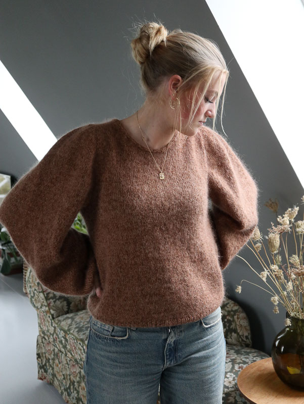 Halskanten og ærmerne er designet med en smuk I-cord kant, som tilføjer en delikat detalje og giver blusen et rent og raffineret udseende. Ærmerne er strikket med en teknik, der giver dem et langt, draperet look, hvilket bidrager til blusens elegante udtryk.