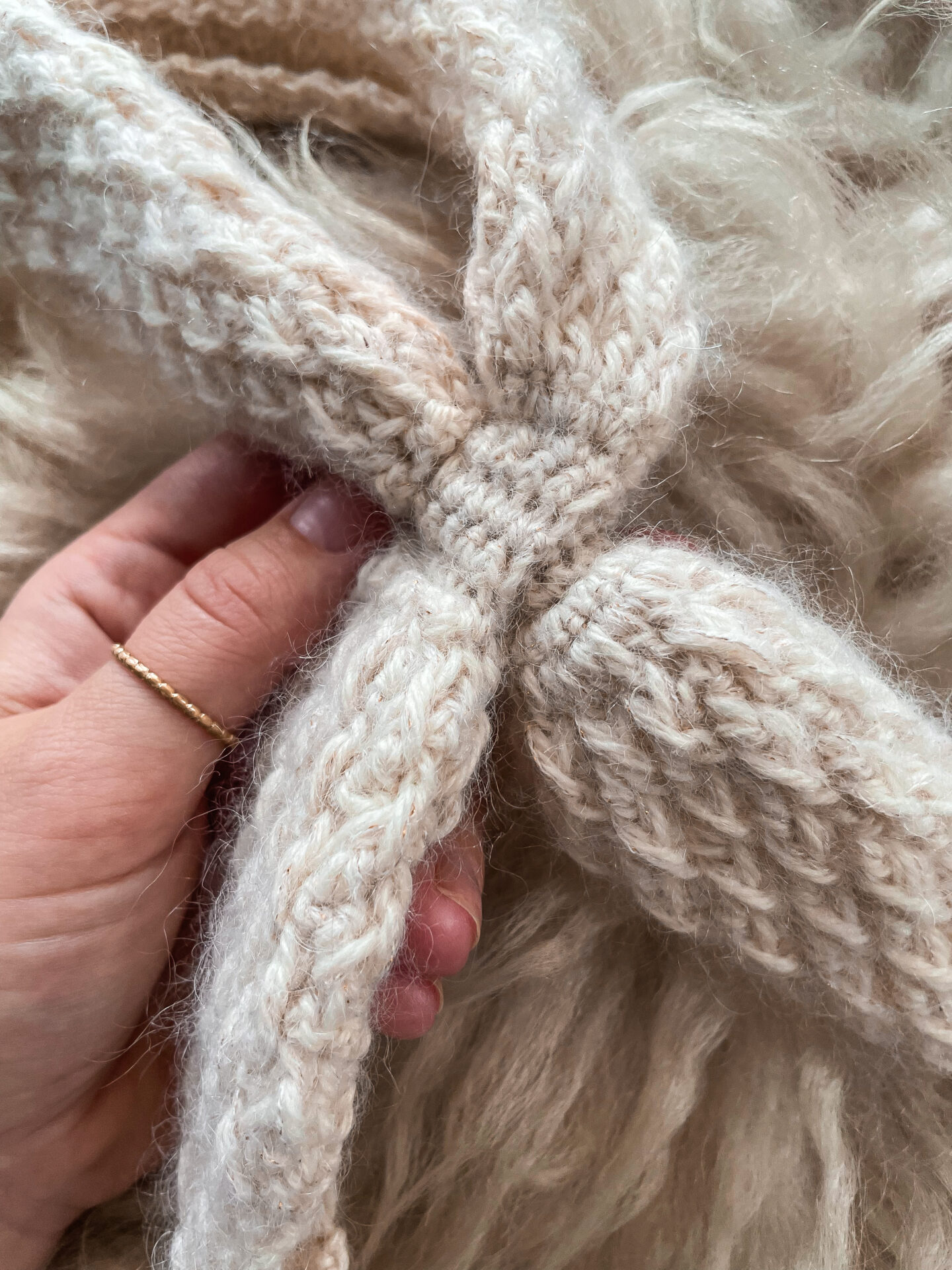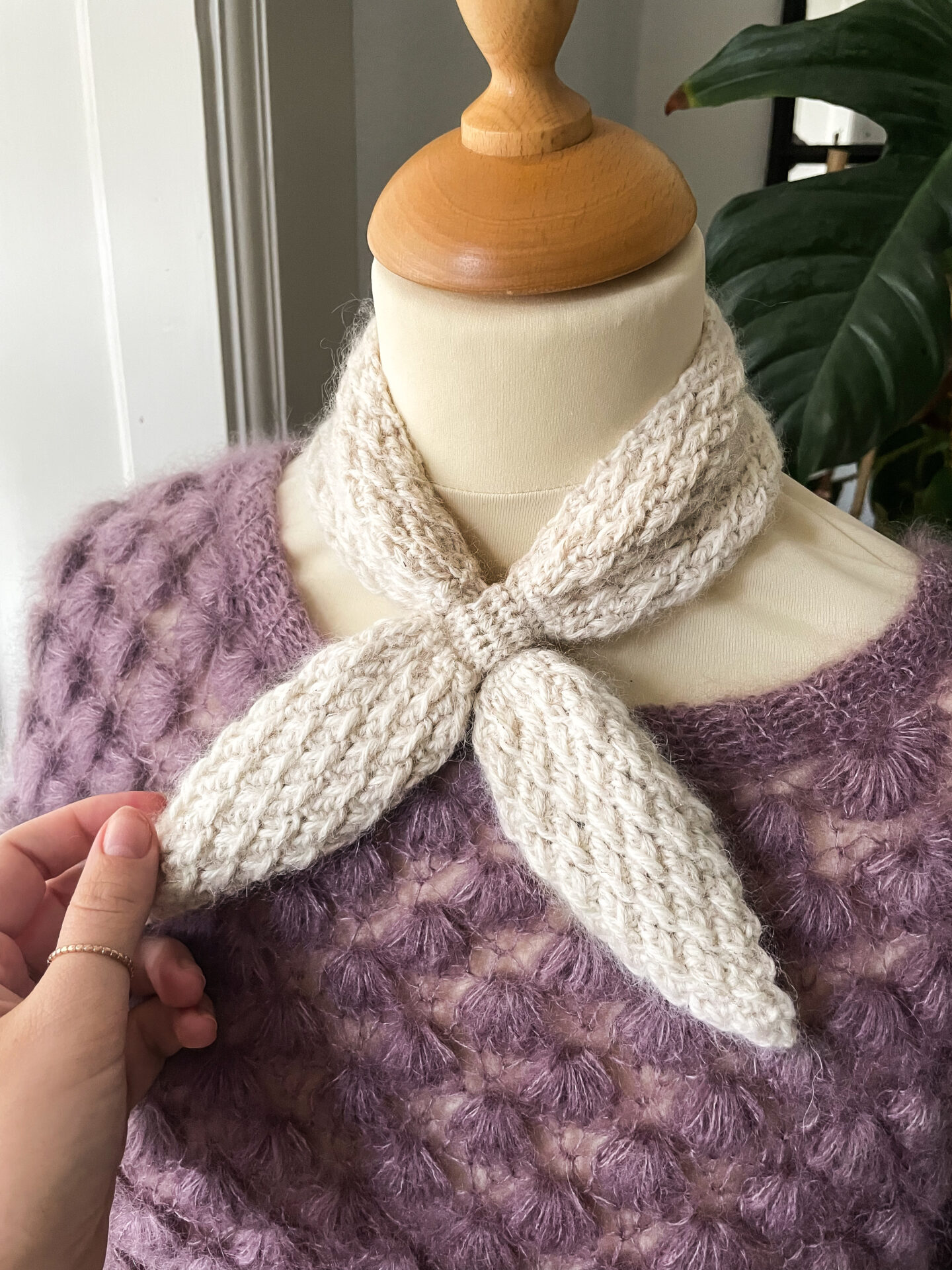 Alpine Bow Tie Scarf af Hooked by Cille er et lille, fine tørklæde det hækles i ét stykke fra spids til spids.