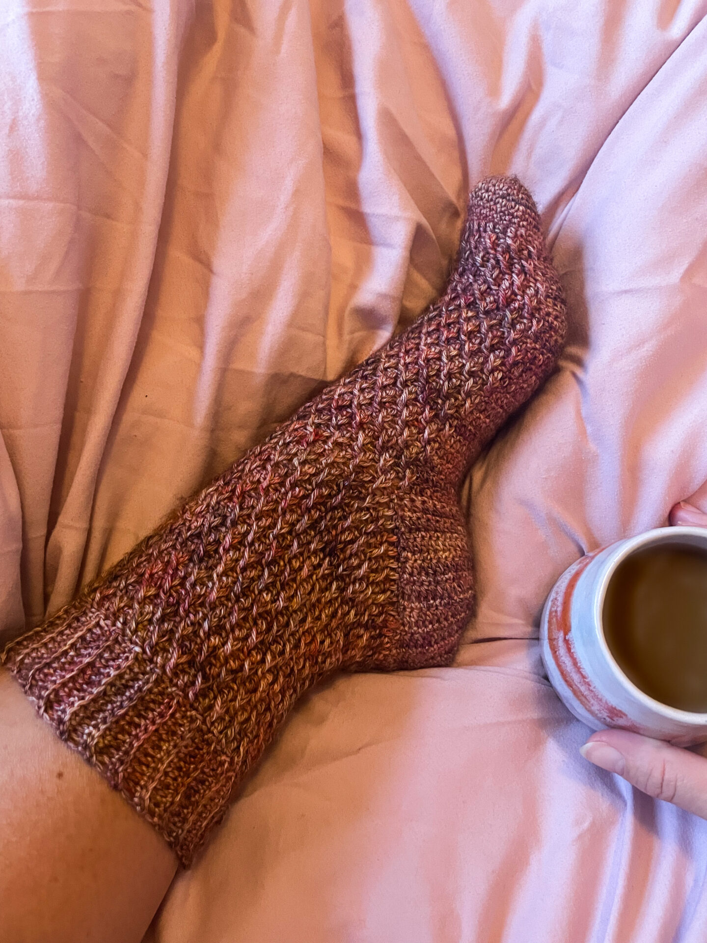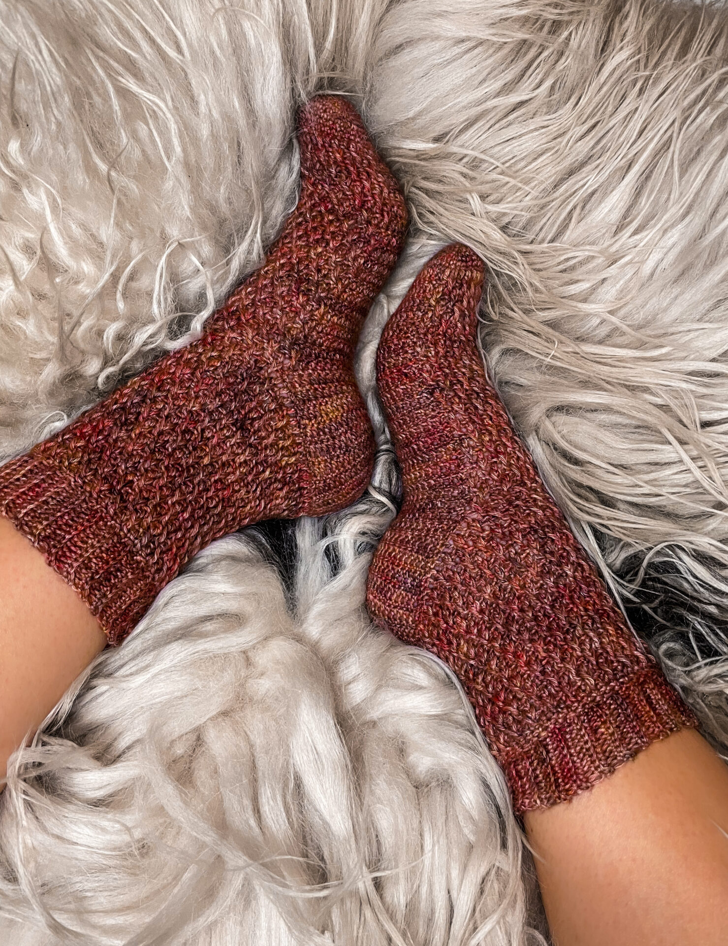 Alpine Socks hækles på 3 mm med Alpaca Soxx fra Lang Yarns eller Vintage Socks fra Lana Grossa.