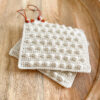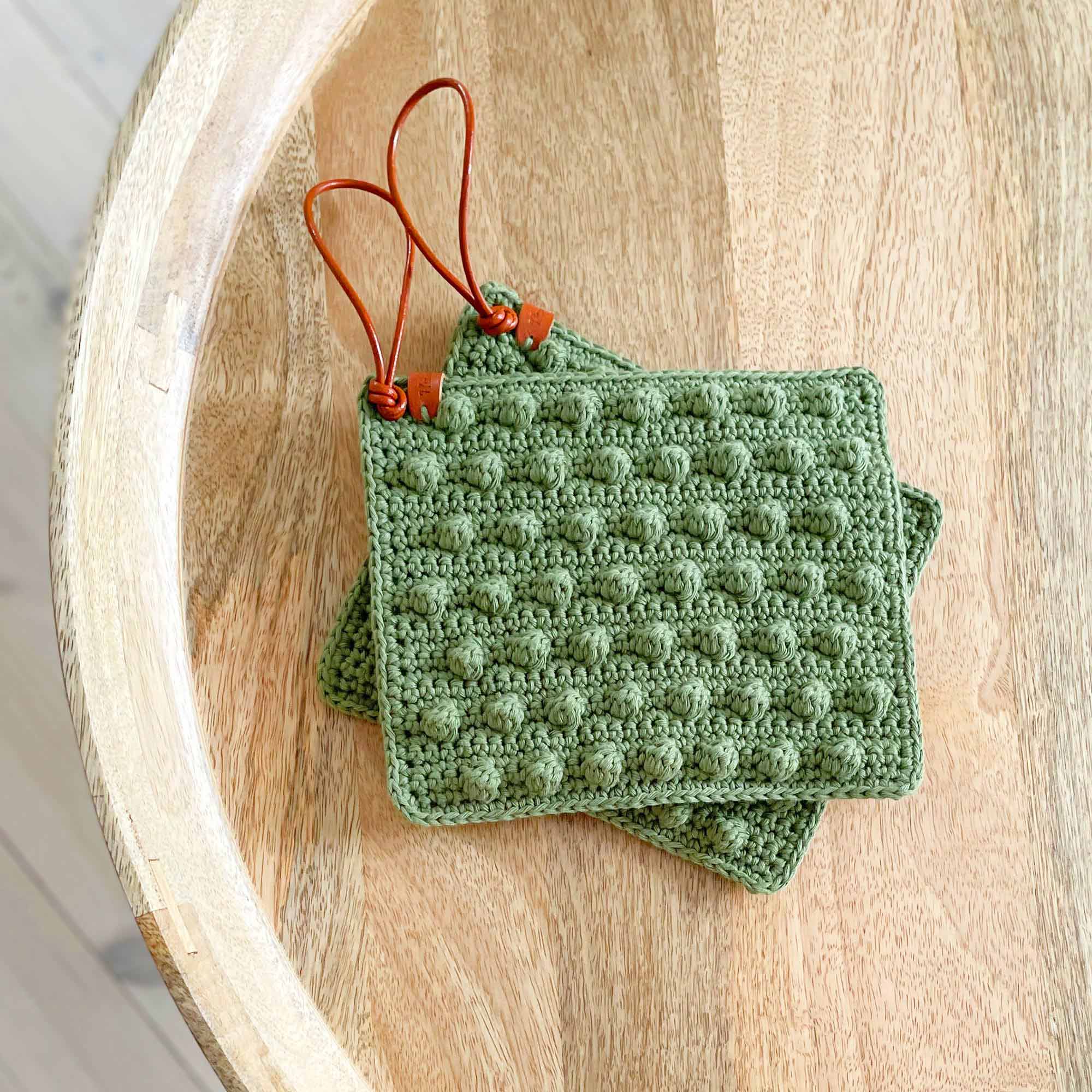 Annemettes boble grydelap af Milla Billa er hæklet med et unikt boblemasker, og stykket er også formet med vendestrik. Et simpelt lædermærke eller en anden form for snor kan fastgøres i enden til ophængning.