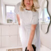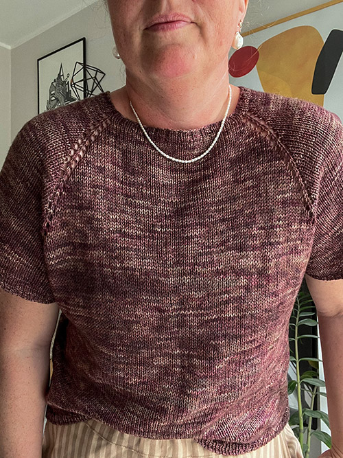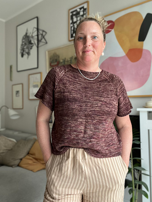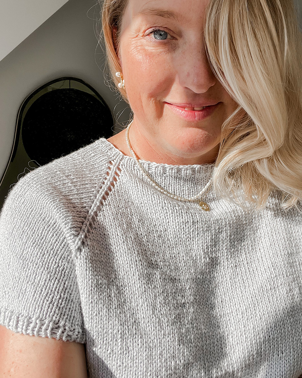 Another Knitted Tee af Dorte Bak er en begyndervenlig strikkeopskrift på en klassisk og feminin T-shirt, der har et let og luftigt udtryk. Den strikkes oppefra og ned med vendepinde i nakken og ærmerne for at forme pasformen, og de dekorative udtagninger sker med omslag, som skaber et elegant hulmønster langs raglanen. Det giver et smukt og feminint snit og gør opskriften til et ideelt projekt – også for mindre erfarne strikkere.