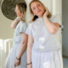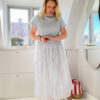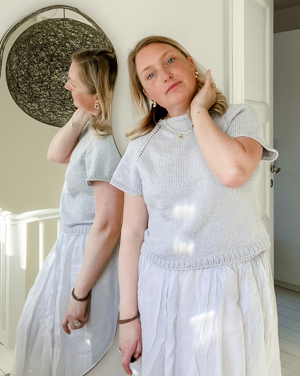 Tee'en er designet til at kunne bruges hele året. Der medfølger nemlig to garnforslag: et til sommer og et til vinter eller overgangsperioder. Til en let og kølig version kan du bruge Norma fra Lang Yarns (55% bomuld, 35% modal, 10% viskose), som har en løbelængde på 135 m pr. 50 g. Alternativt kan du vælge luksuriøse MeriSilk fra Dorte Bak Knitting, en eksklusiv blanding af 50% extrafine merino og 50% tussah silke, med hele 400 m pr. 100 g. Begge giver smukke resultater og understøtter det feminine udtryk.