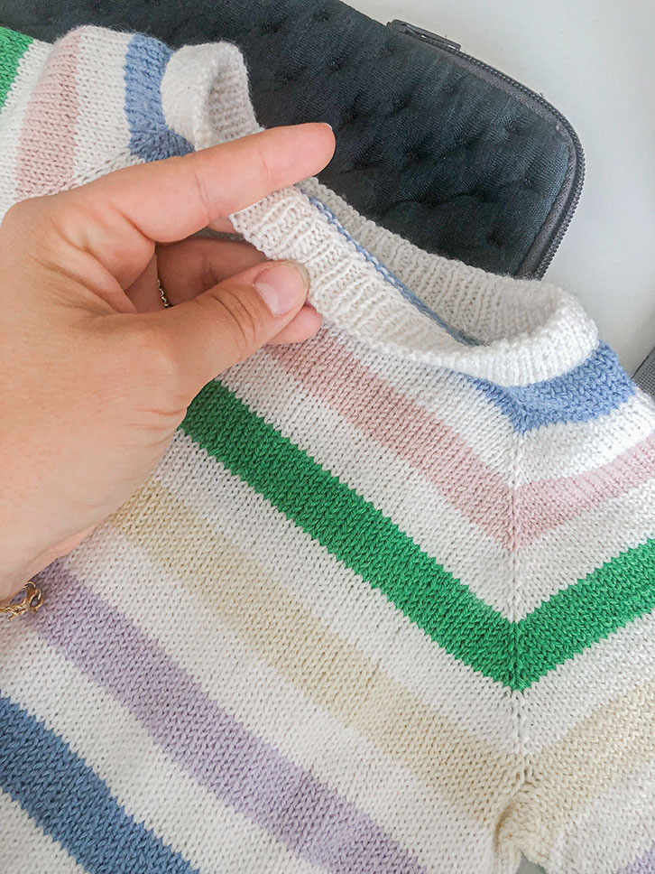 Antalya Tee Junior af KnitVik strikkes oppe fra og ned med raglanudtagninger i glatstrik i forskellige farver for at skabe et stribet mønster. Bagsiden/vrangsiden af halskanten strikkes i Rib (1r,1vr) på p. 2,5 mm (40 cm), som skjules bag et ombuk. På forsiden af halskanten strikkes glatstrik på p. 3 mm (40 cm). Ribben gør at halskanten lægger sig pænt ind til halsen. Kroppen og ærmerne afsluttes med en 2 cm ombuk, som syes op til sidst. Ærmerne strikkes rundt på rundpind med magic loop-teknik eller med strømpepinde.