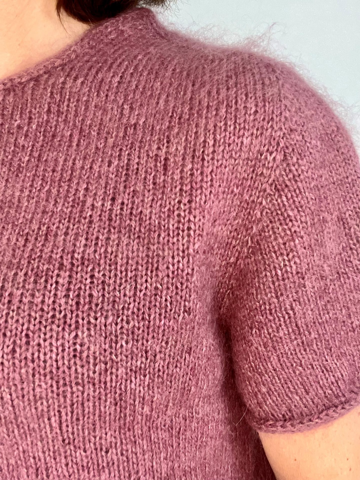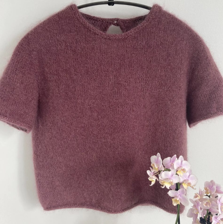 Apple Blossom Tee er en elegant bluse strikket oppefra og ned i en tråd Coast og en tråd Kid Silk Mohair. Den strikkes på pind 4 mm, har raglanudtagninger og smukke i-cord kanter. Fås i str. S–2XL.