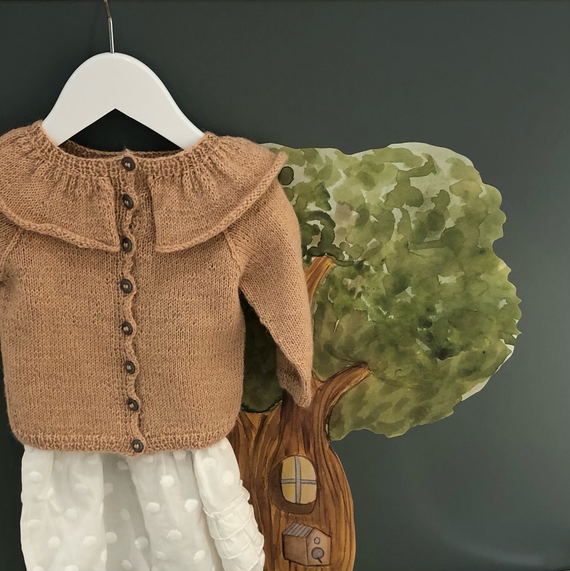 Astrid Cardigan med flæse er strikket med lange ærmer og en lille ribstrikket bort med knapper.