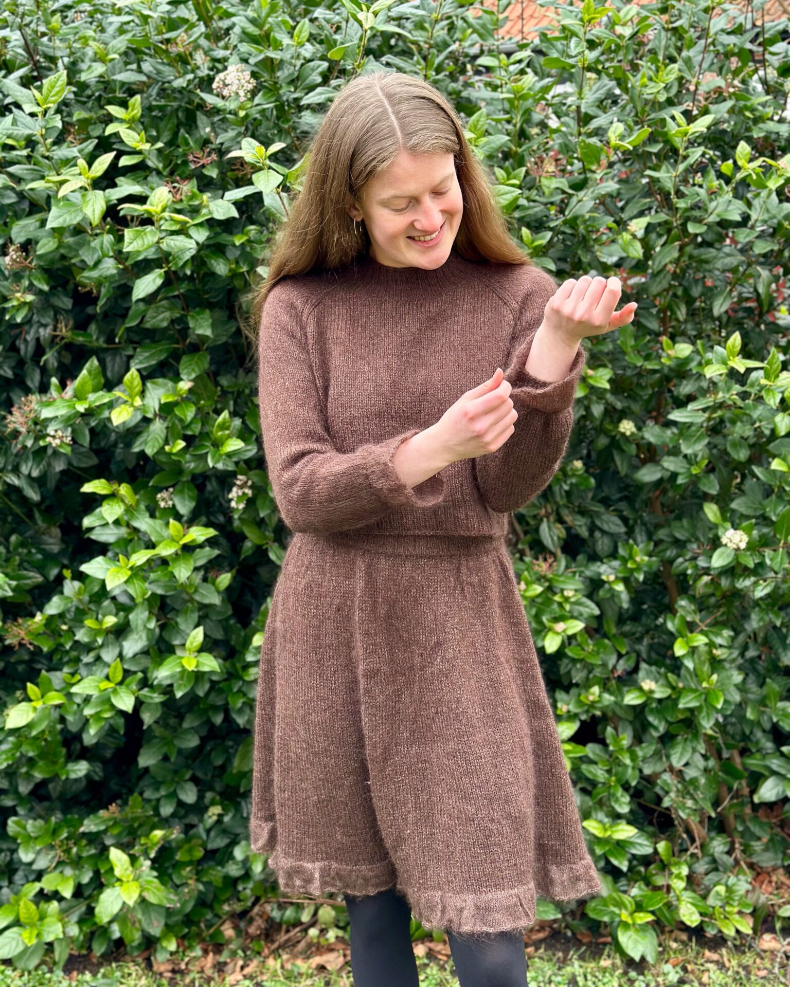 Aurora Sweater af Knitlidt er den fineste korte sweater. Den har flotte raglanudtagninger og feminine flæser på ærmerne. Aurora Sweater passer til Aurora Skirt.