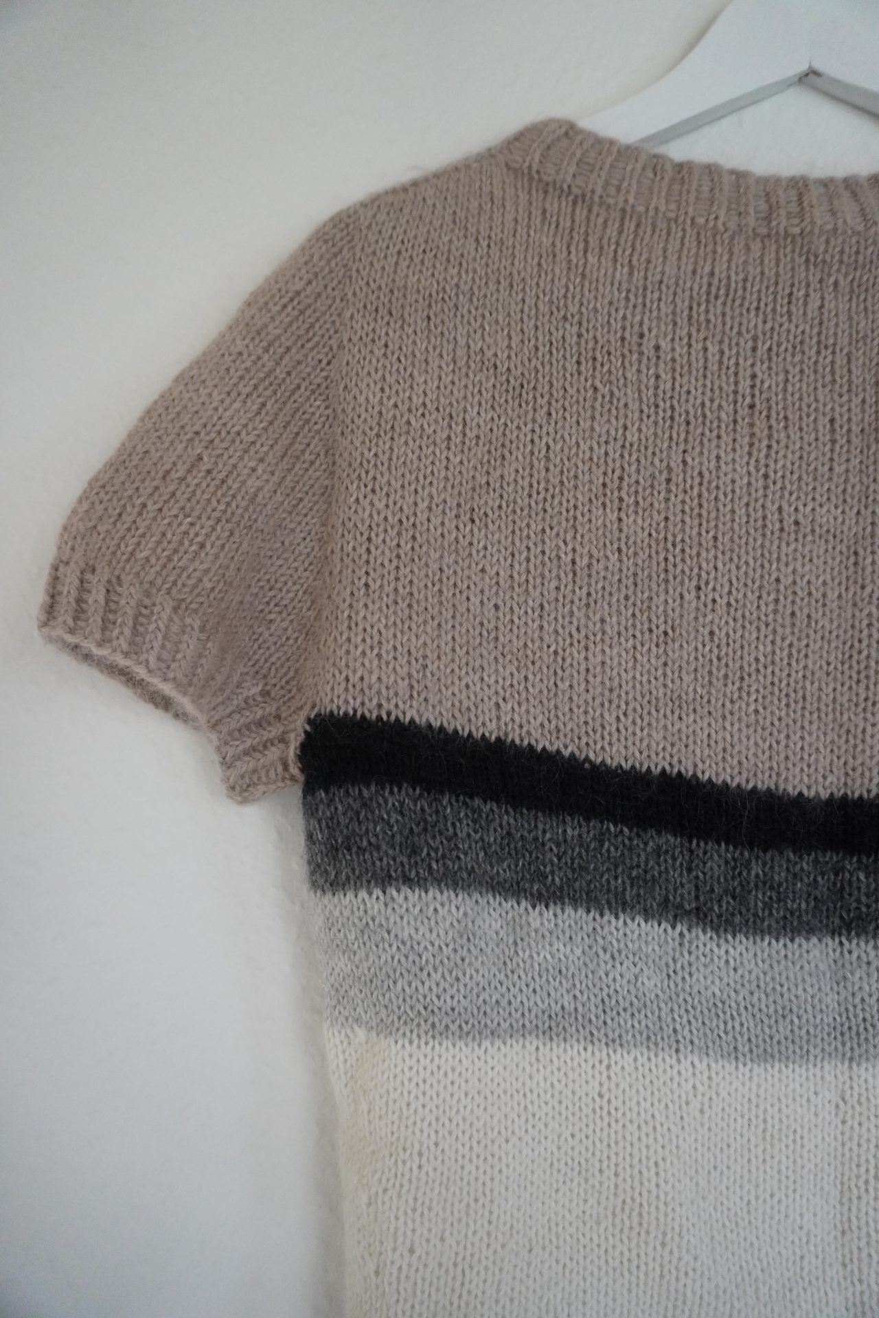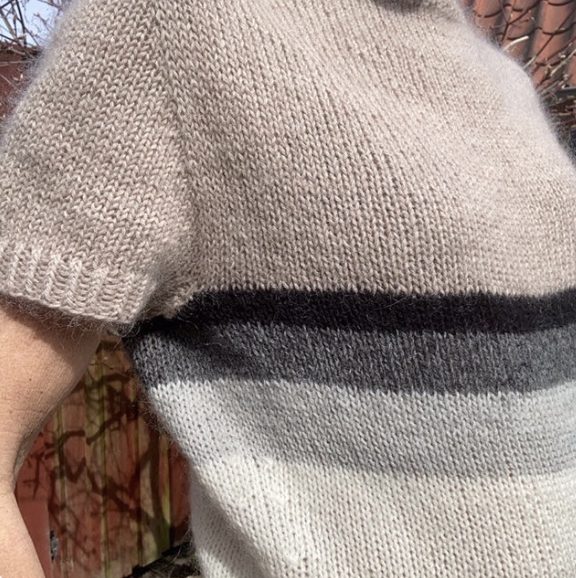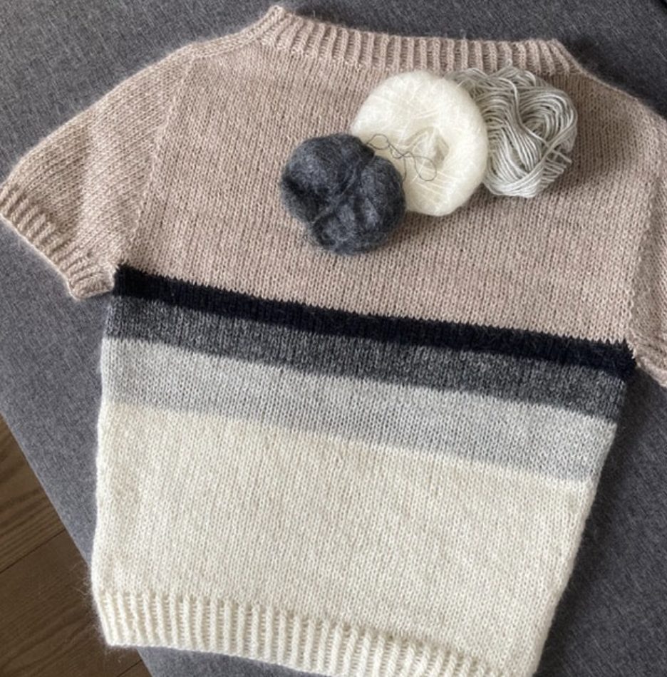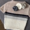 I stribet version tilføjes farver som sort, grå og perlegrå, og her anvendes mindre mængder af hver farve. Modellen er oplagt til restegarnsprojekter, hvilket gør den både bæredygtig og økonomisk.
