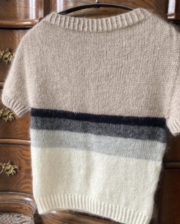 T-shirten strikkes i glatstrik og formes med både skulder- og ærmeudtagninger, der giver en flot pasform uden behov for montering af separate dele. Nederst på kroppen er der mulighed for at forme silhuetten yderligere med indtagninger, hvilket giver et feminint og flatterende udtryk – alternativt kan disse udelades for en mere afslappet pasform.