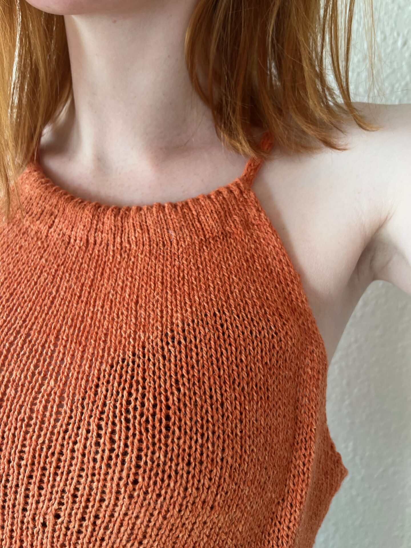 Toppen strikkes i Coast fra Holstgarn, et let og blødt garn i en smuk farve – her brugt i farven Amber. Garnet har en løbelængde på 350 m per 50 g, og forbruget er cirka 100 g til alle størrelser. I størrelse M er der kun brugt 57 g, så det er muligt at nøjes med ét nøgle til de mindre størrelser, hvis man f.eks. vælger at bruge silkebånd i stedet for strikket snor eller tilføjer striber i en anden farve.