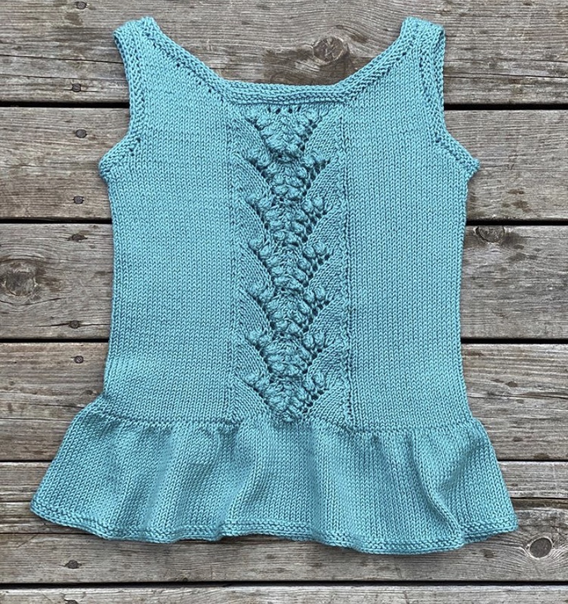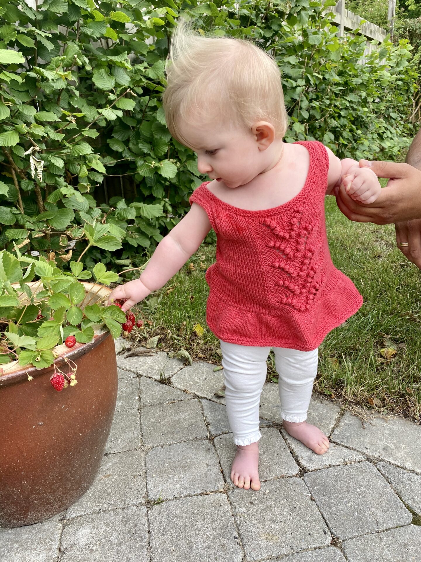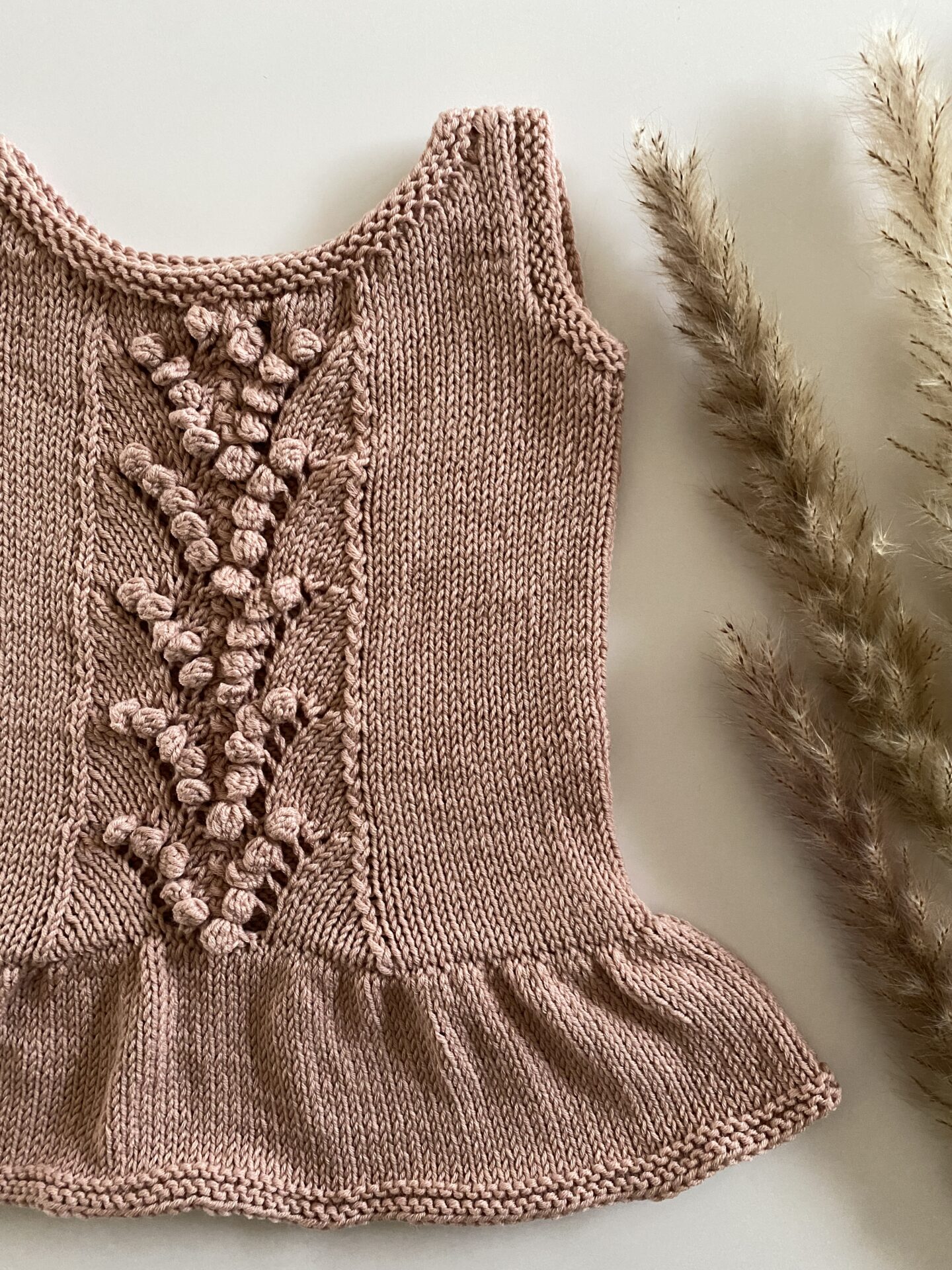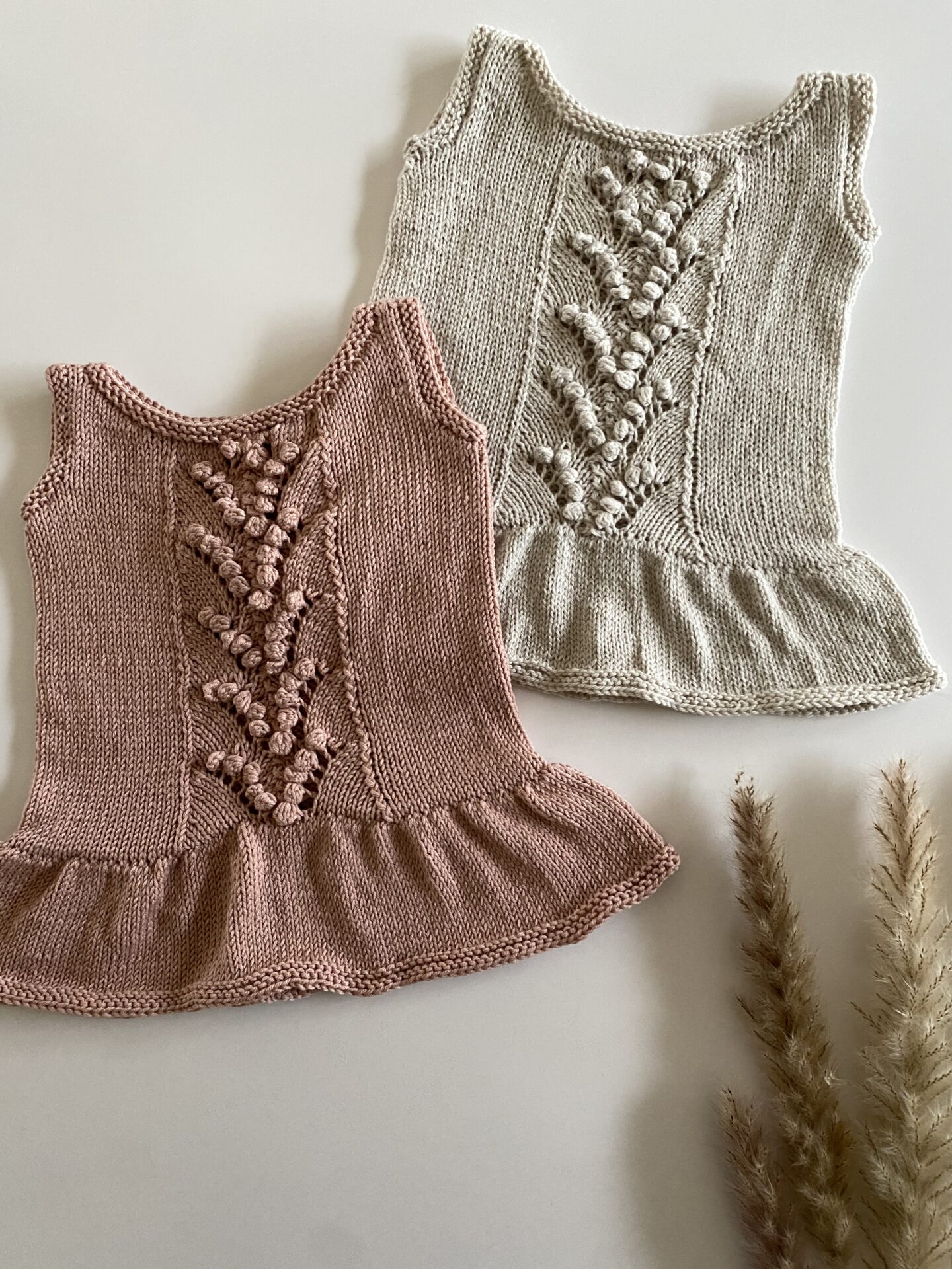 Bellas Sommertop fra Kracun Knitwear er en skøn og feminin sommertop til de mindste. Den kan også bruges som øverste lag over en langærmet bluse i de kolde måneder.