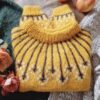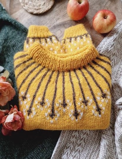 The sweater construction begins with ribbing, continues with body and sleeves knitted separately in the round, and then all pieces are joined to work the decorative yoke. After the yoke, a ribbed neckline is added, which can be knitted either 3.5 cm for smaller sizes or longer, up to 7 cm, for the larger sizes. The collar can be folded and sewn down for extra structure.