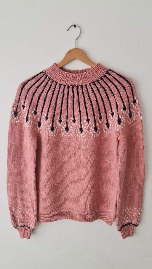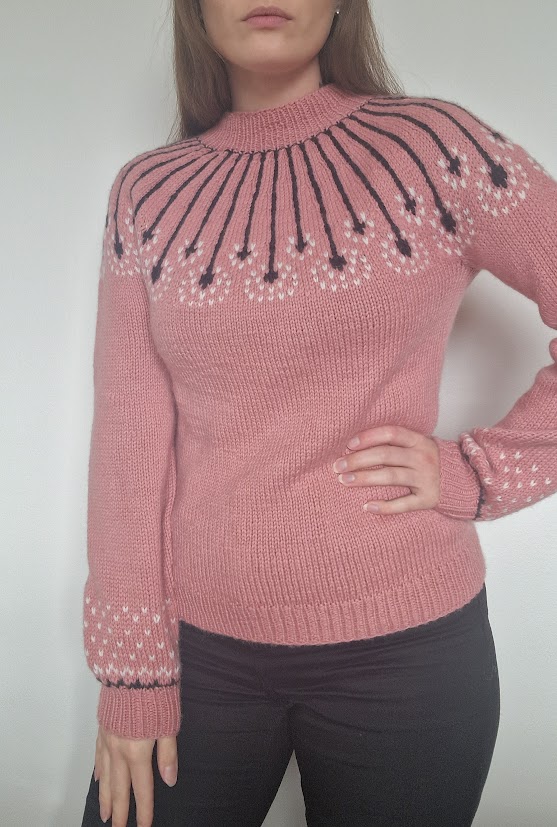The Bifukolla sweater, designed by Knitterfromiceland (Lopamunstur), is a modern interpretation of the traditional Icelandic yoke. This pattern is knitted from the bottom up in the round. The body and sleeves are worked separately before being joined together for the yoke, where the striking colorwork unfolds in rhythmic, geometric patterns. The design is written for sizes ranging from XXS to 5XL, with detailed measurements included so you can achieve the ideal fit whether you prefer a close or a more relaxed silhouette.