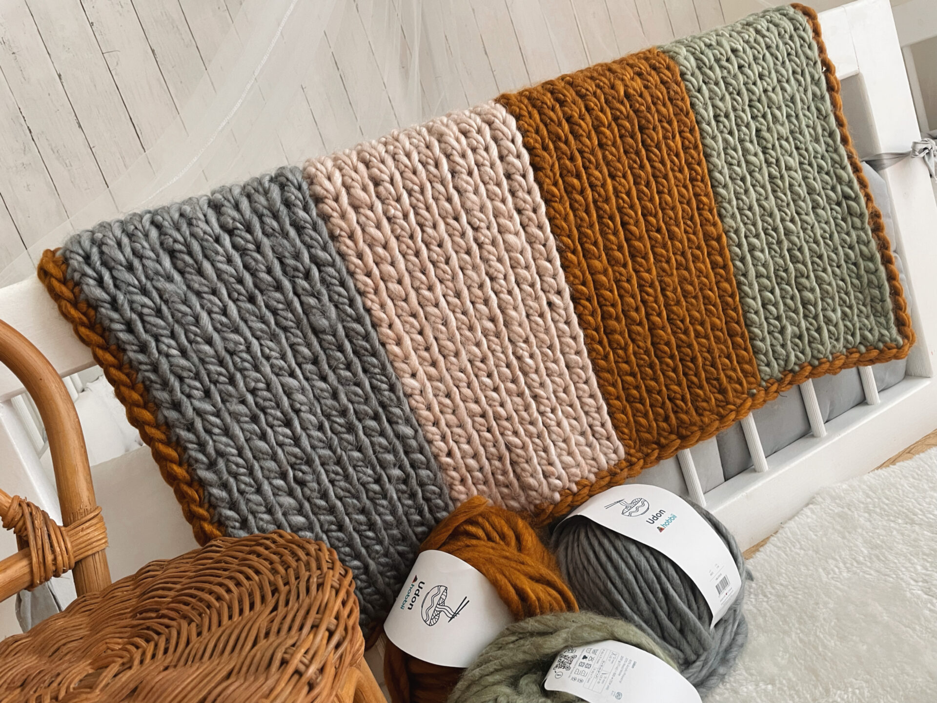 Der afsluttes med en flot kant af fastmasker hele vejen rundt, hvilket giver tæppet et professionelt udtryk. Garnets løbelængde er ca. 50 m pr. 100 g, hvilket svarer til ca. 25 m pr. 50 g. Hæklefastheden for det strikkelignende mønster er 10 x 10 cm = 6 masker x 8 rækker, når der bruges en 15 mm nål.