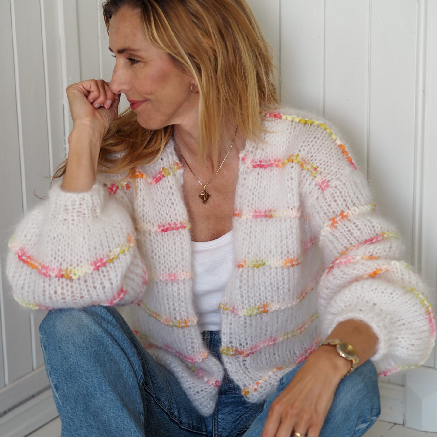 The jacket is knitted using Bella by Permin, composed of 75% mohair, 20% wool, and 5% polyamide. This yarn is known for its luxurious feel and lightweight quality. With a yardage of 145 meters per 50 grams, it offers both warmth and breathability. For the distinctive stripes, Gelato by Lana Grossa is used – a yarn made of 52% cotton and 48% recycled polyamide with a yardage of 80 meters per 100 grams. The combination of Bella and Gelato gives the jacket an exciting texture and a beautiful contrast between soft fluffiness and more structured elements.