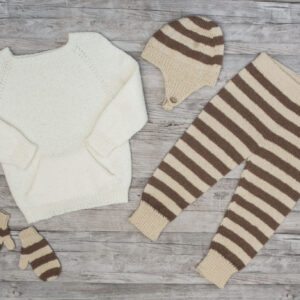 Bysse Jacket is worked with two strands of Bella (main color) and one strand of Gelato (for the stripes). The base color is white, while the stripes add a playful and elegant detail to the design. The project begins at the bottom and is worked upwards. The body is knitted back and forth on a circular needle, and then divided into front and back pieces at the armholes. The entire garment is worked using double yarn, except for the stripes, which are worked with a single strand of Gelato. The front pieces are shaped with a classic V-neckline, and the shoulders are sewn together at the end. The sleeves are worked top-down in the round, making it easy to adjust their length as needed.