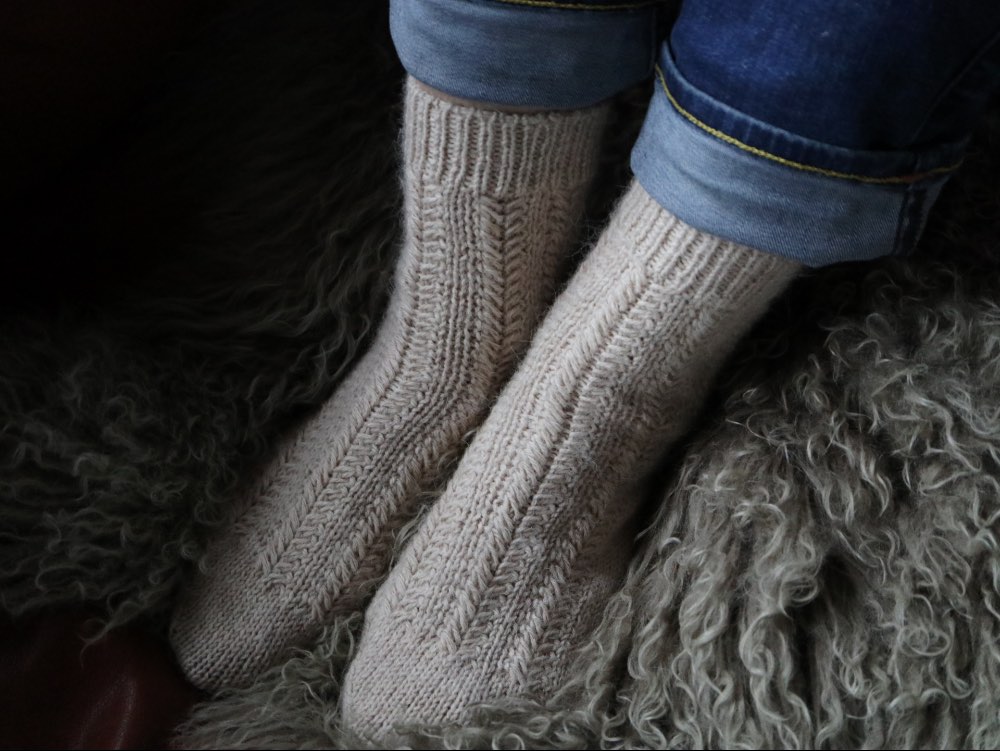 Opskriften strikkes på strømpepinde 2,5 og 3,0 mm (eller rundpind til magic loop, hvis du foretrækker det). Ribkanten strikkes på 2,5 mm, hvorefter der skiftes til 3,0 mm til mønster- og glatstrik. Strikkefastheden er 25 m x 34 p i glatstrik på pind 3,0 mm = 10 x 10 cm og 27 m x 34 p i fjermønster = 10 x 10 cm.
