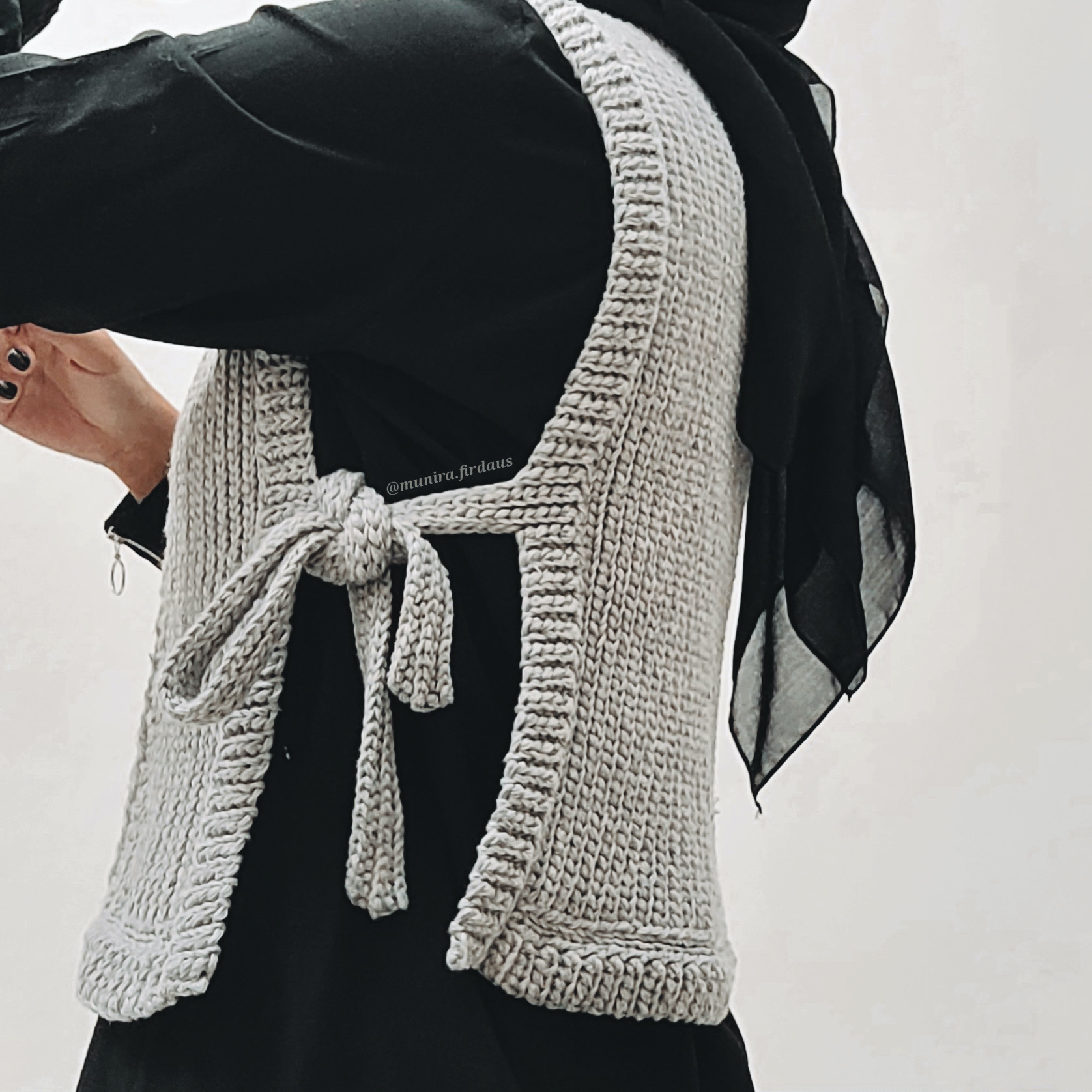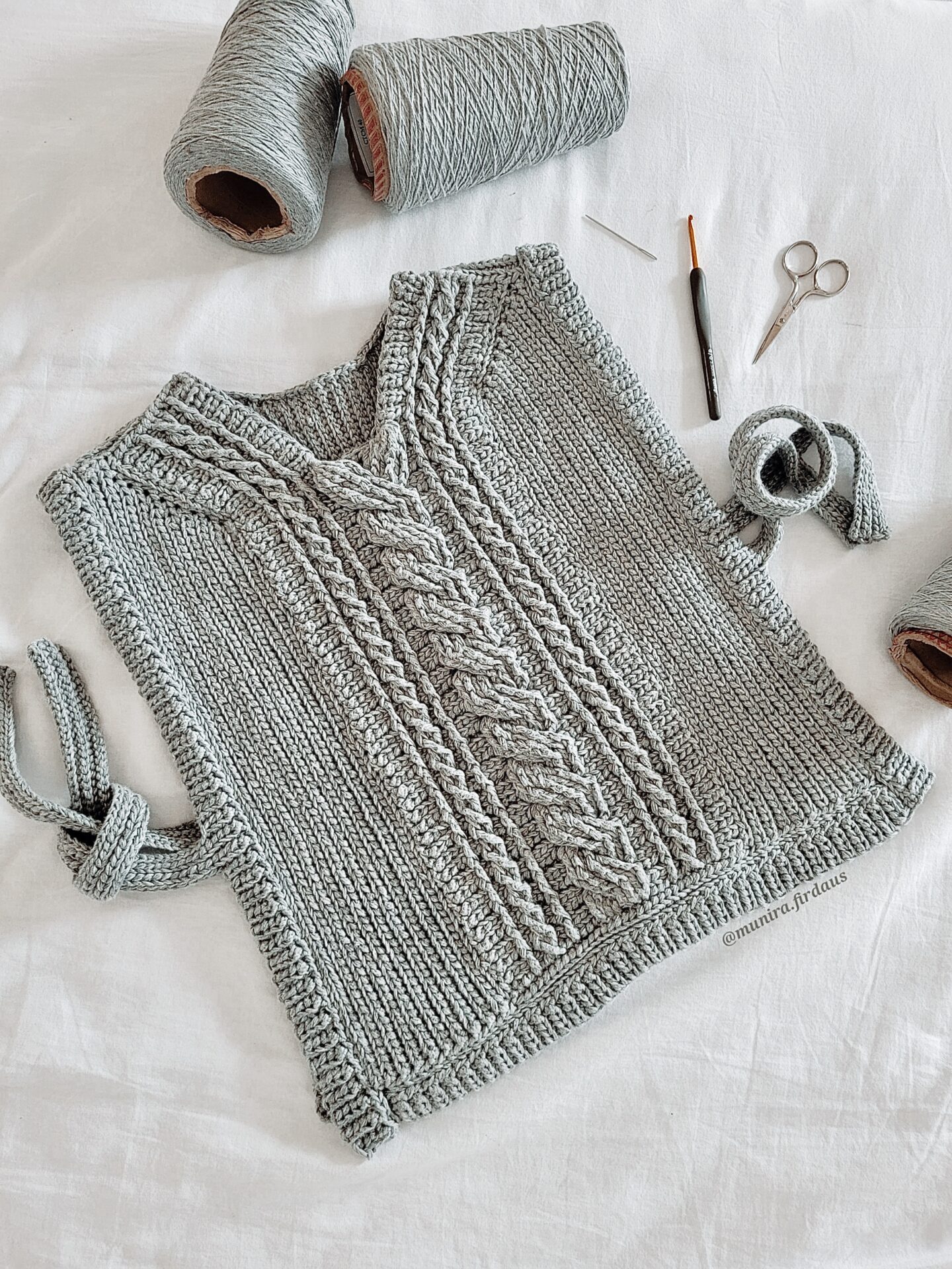 Dahlia Twisted Vest DK er en elegant og moderne hækleopskrift designet af Enida Avdic, som kombinerer kabelmønstre og strikkelignende hækleteknikker til en stilfuld vest med iøjnefaldende detaljer. Vesten er konstrueret i to paneler – forstykke og bagstykke – der samles ved skuldrene og afsluttes med ribkanter og lange bindesnore i siden. Det giver et fleksibelt og justerbart fit.