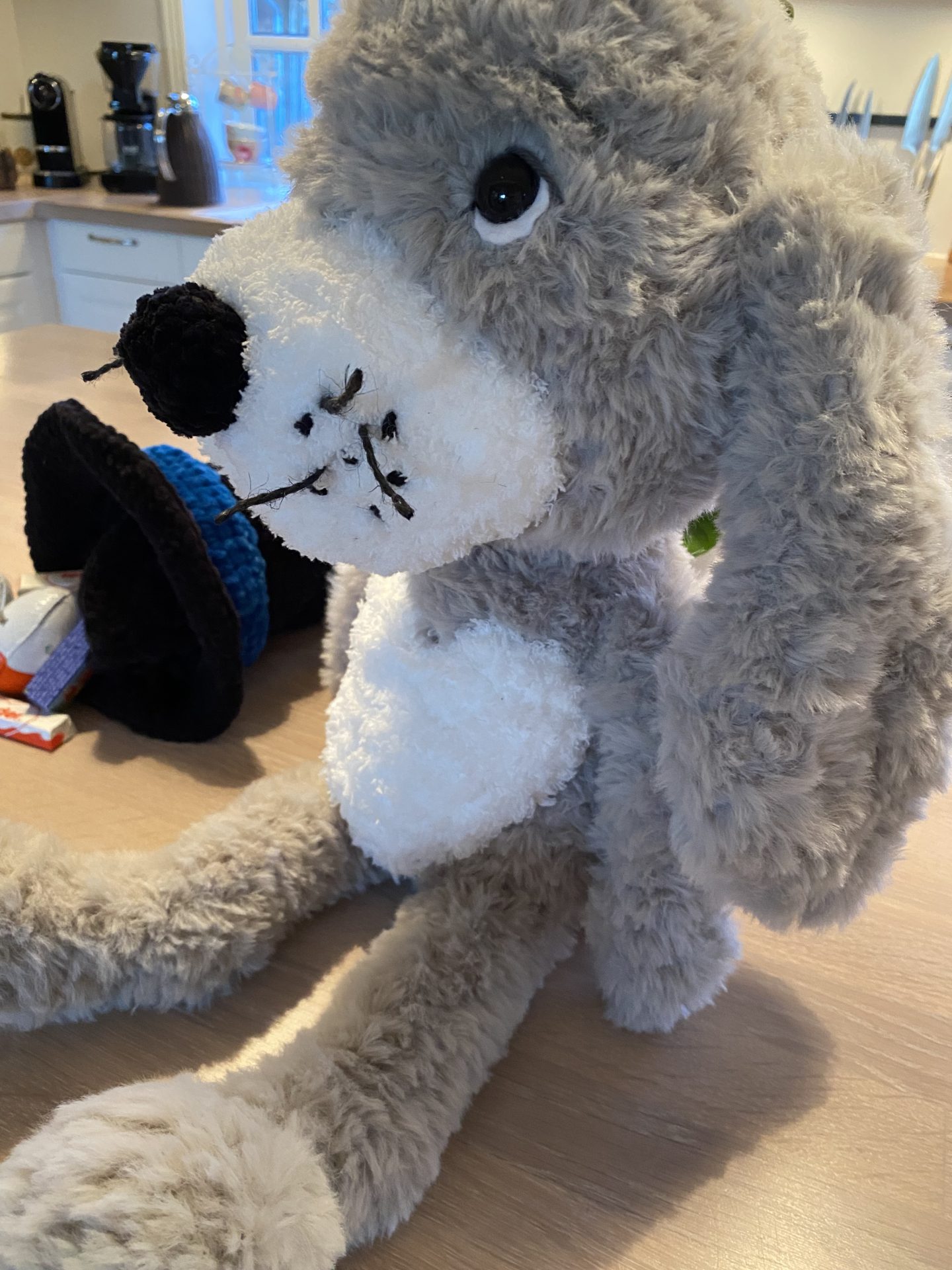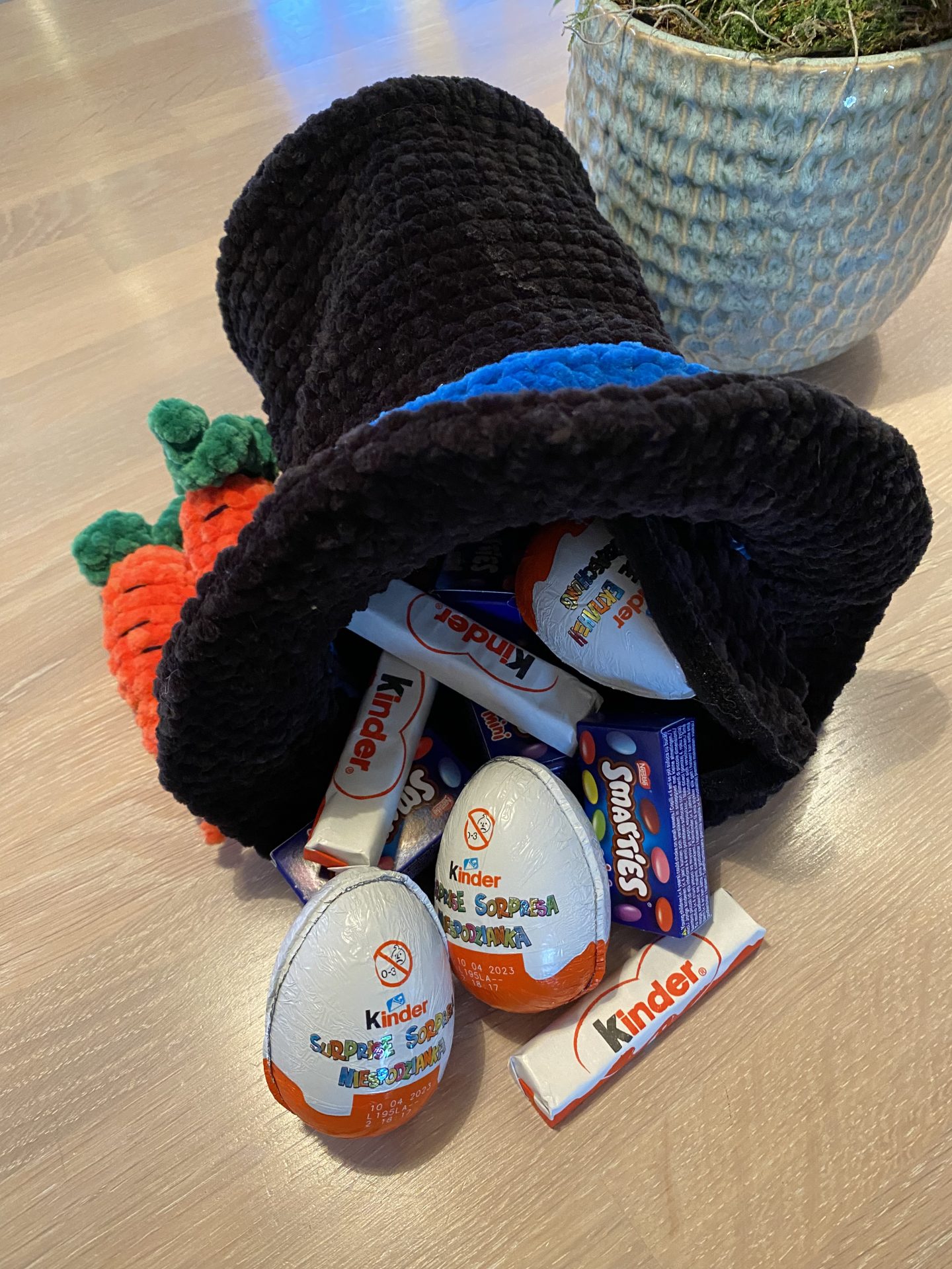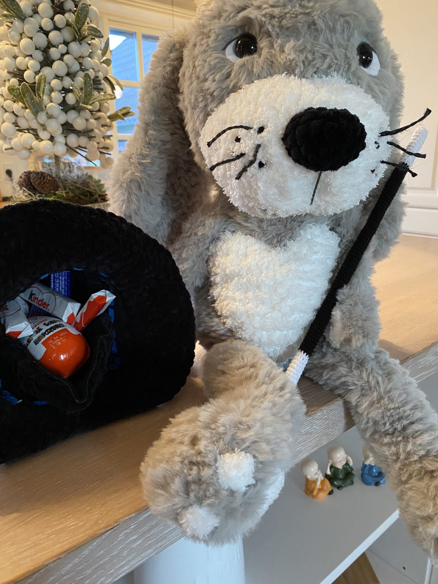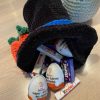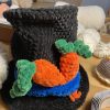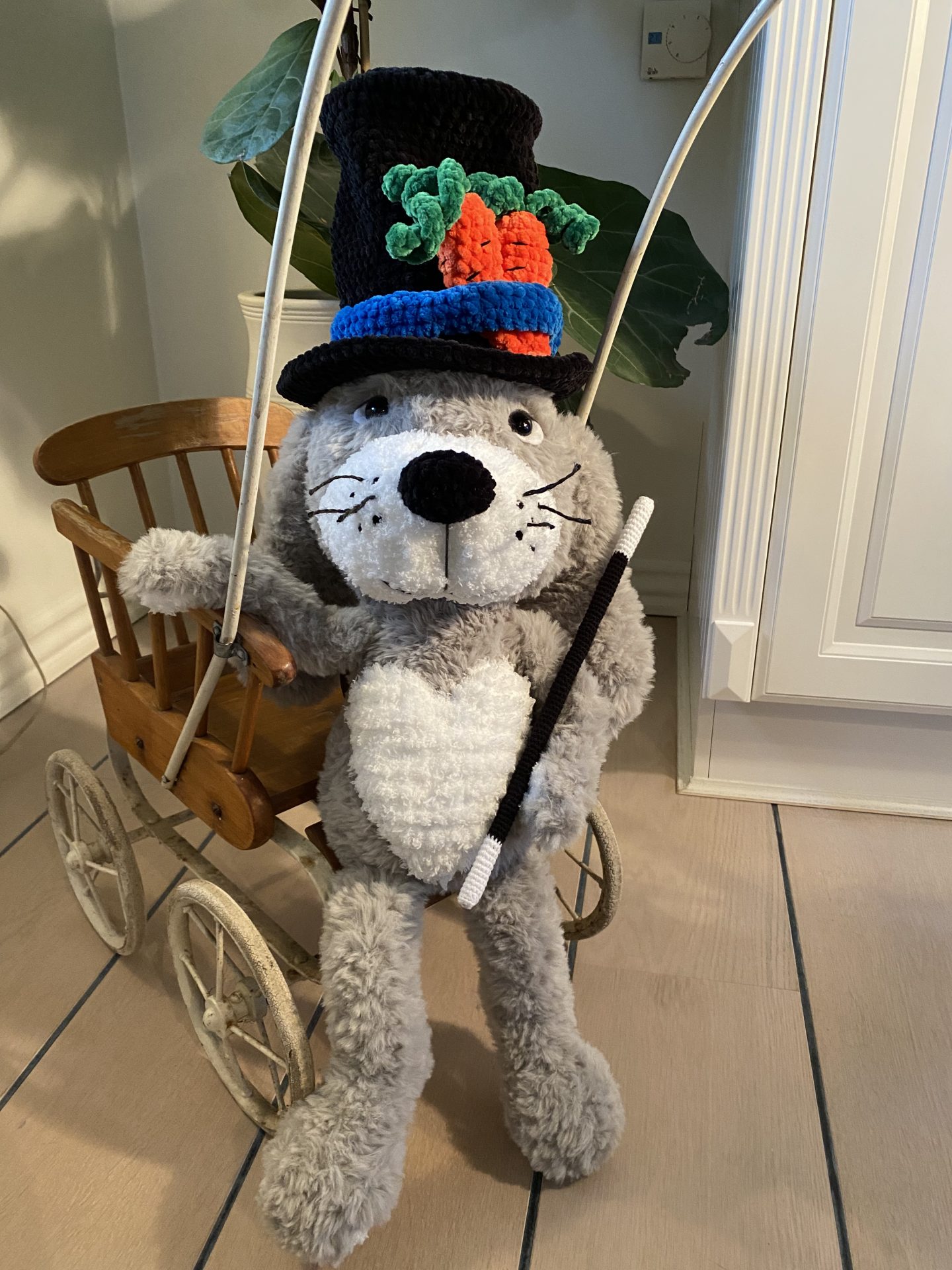 Den magiske kanin er perfekt til påske da der er plads til hemmeligheder i hatten. Den er hæklet med de fineste detaljer; tryllestav, sort snude, gulerødder i hatten og et stort hjerte på midten.