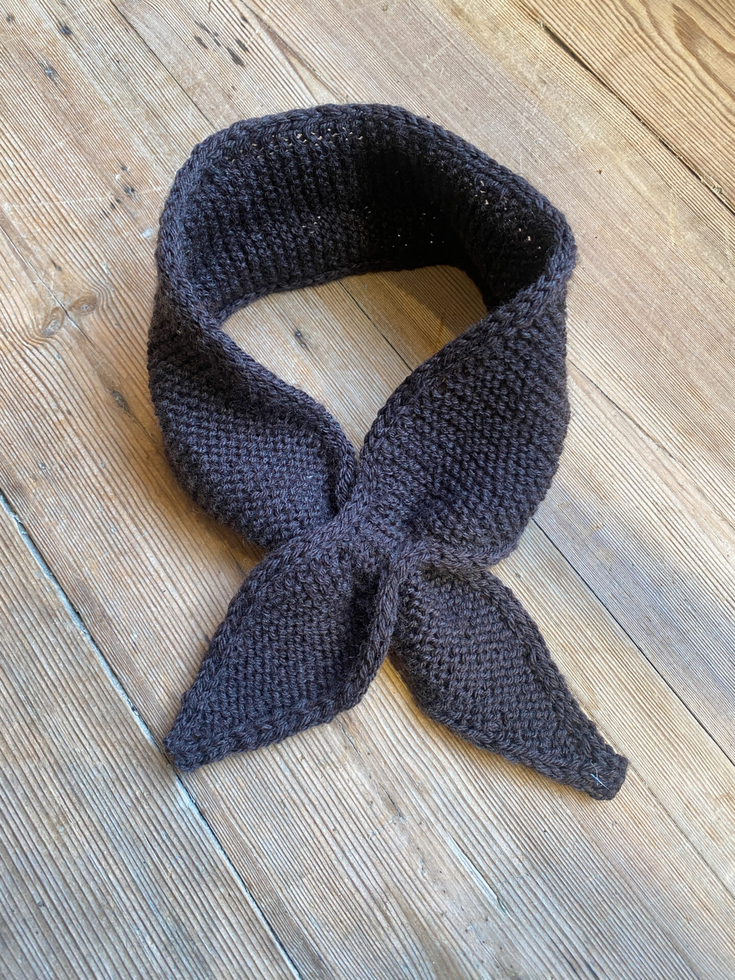 Der strikkes udtagninger og indtagninger til at forme spidserne ved den ene spids strikkes der et dobbelt lag, til at danne et “hul”, som den anden spids kan tages igennem. På den måde holdes tørklædet godt på plads, men uden man selv skal binde en knude.
