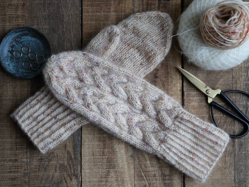 Embla Vanter fra Knitamore er varme og bløde. Vanterne er dekorerede med de fineste fletningssnoninger, som snor sig langs håndryggen. Du kan strikke vanterne i ren uld med en tråd mohair for at opnå et mere blødt og fluffy look.