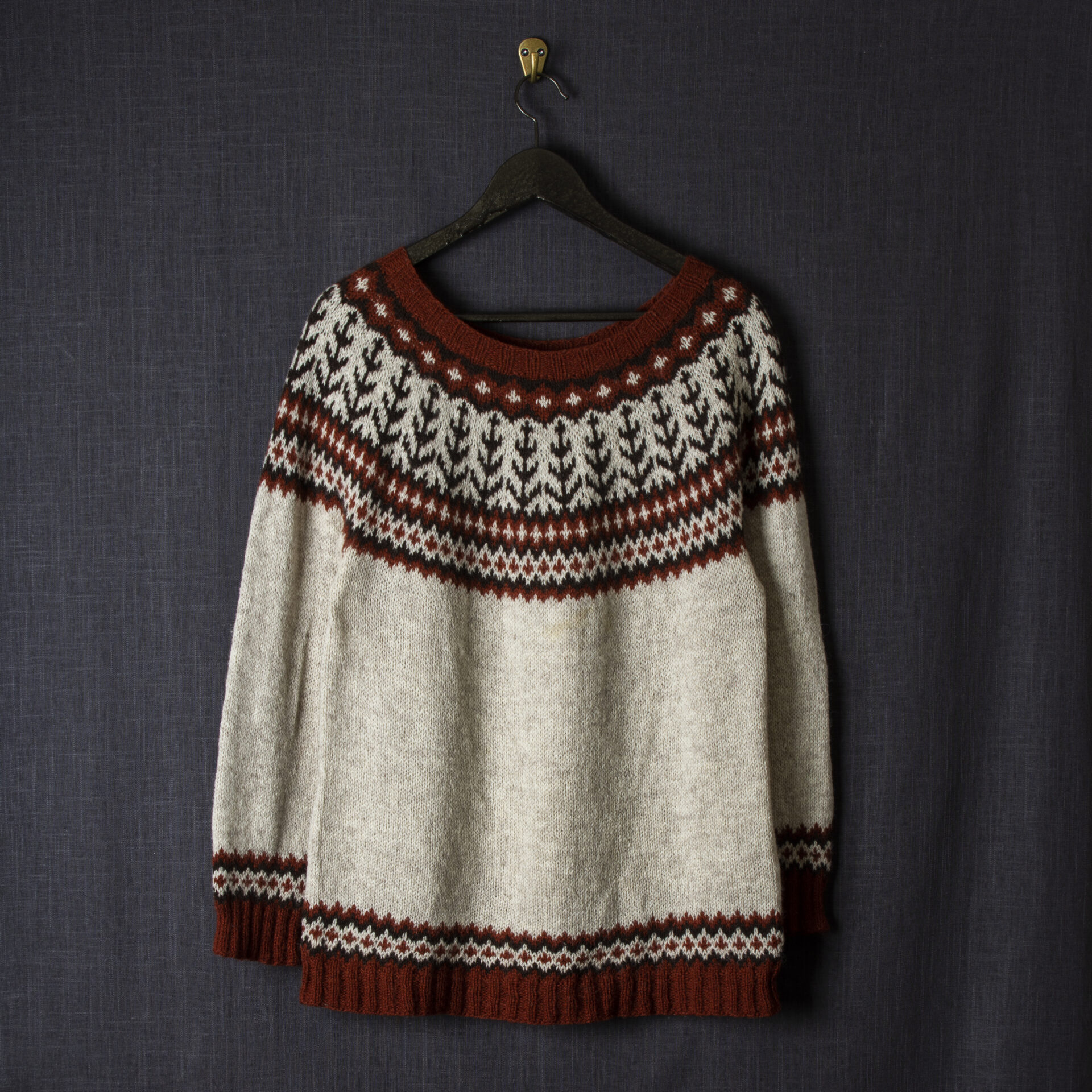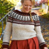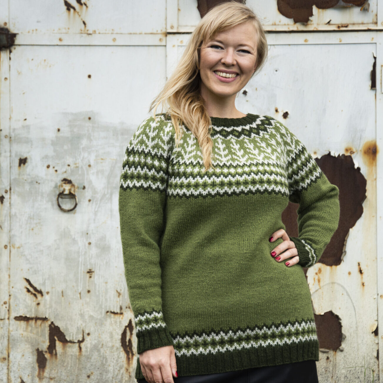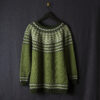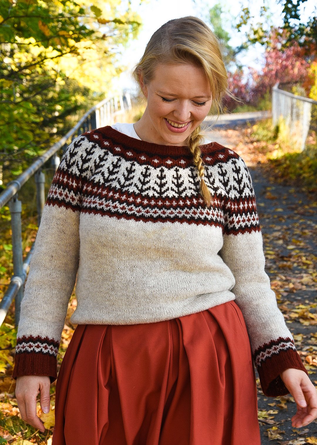 Emblas mamma – en feminin sweater med skovmønster, strikket oppefra og ned. Let taljering for flot pasform. Strikkes på pind 3 og 3,5 mm i Rauma 3-tråds eller lignende garn.