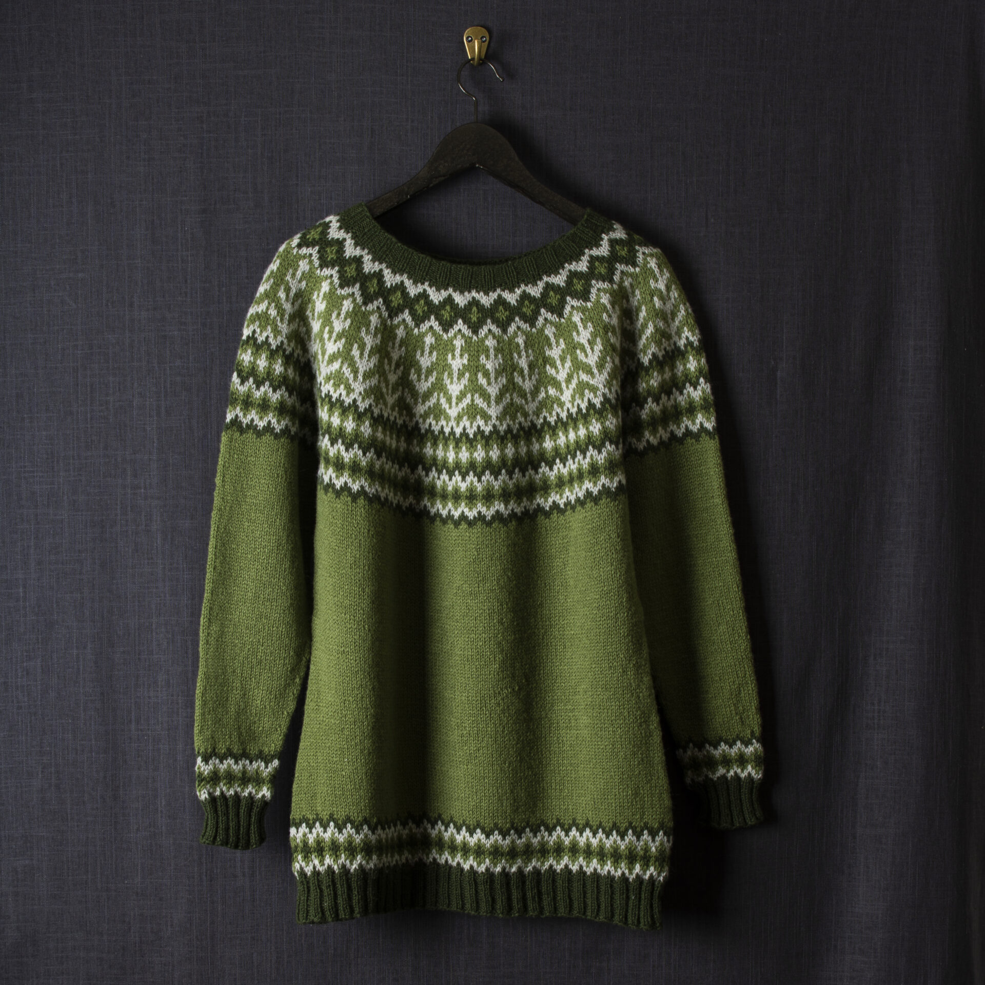 Sweateren kan strikkes i flere forskellige garnkvaliteter. Anbefalede alternativer inkluderer Rauma 3-tråds (100% norsk uld), Hillesvåg Tinde, Sandnes Duo, Drops Karisma, Viking Merino, DSA Alpakka Tweed Classic, samt Camarose Økologisk Hverdagsuld. Det giver dig stor frihed til at vælge netop det garn, der passer til dit budget, farvevalg og ønsket tekstur. Originalmodellen er blandt andet strikket i Rauma 3-tråds, et robust og holdbart garn, som er perfekt til flerfarvestrik.