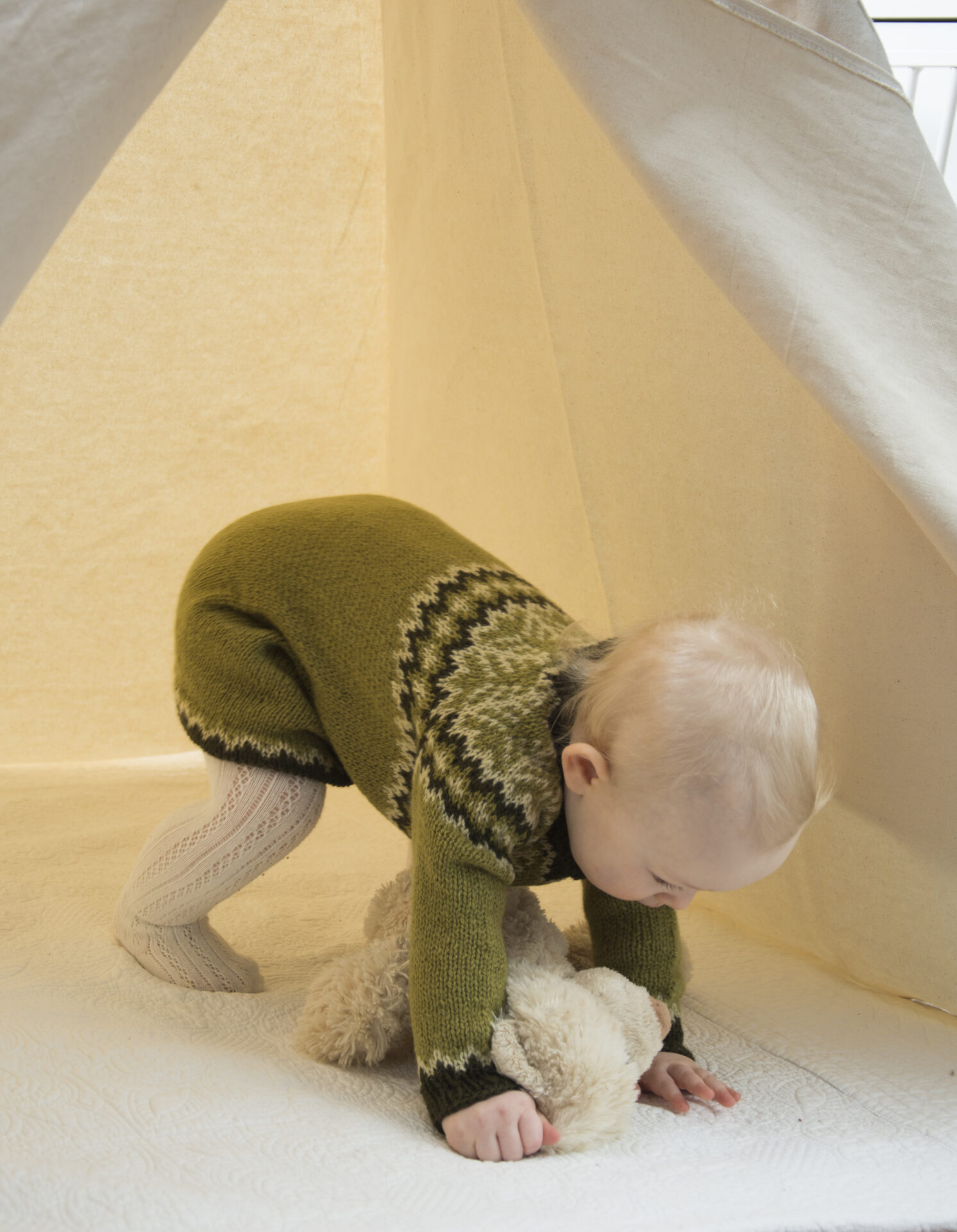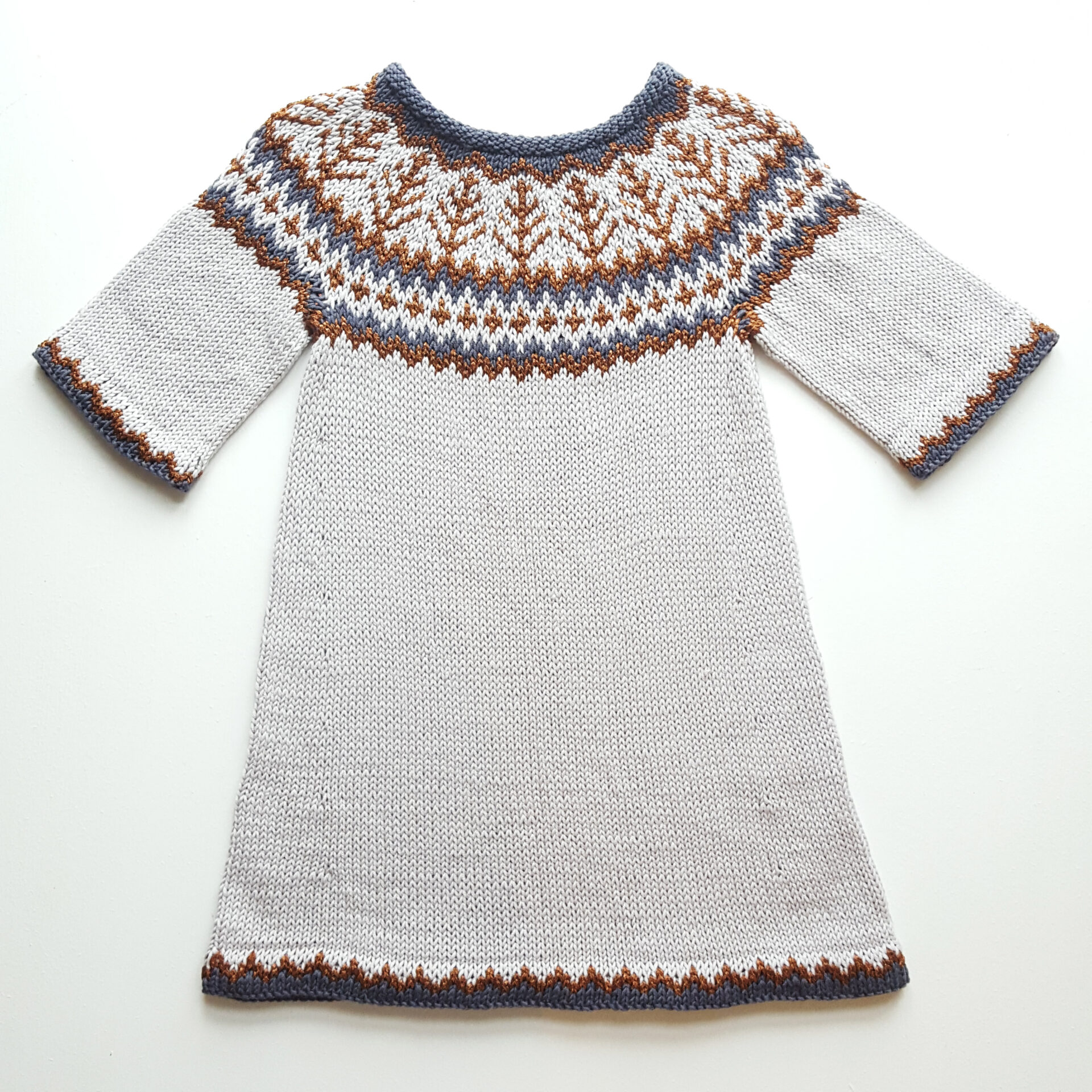 Smuk og alsidig børnetunika med nordisk mønster. Strikkes i Dale Lerke (53 % merino, 47 % bomuld) med pinde 3 og 3,5 mm. Kommer i str. 3 mdr. til 12 år.