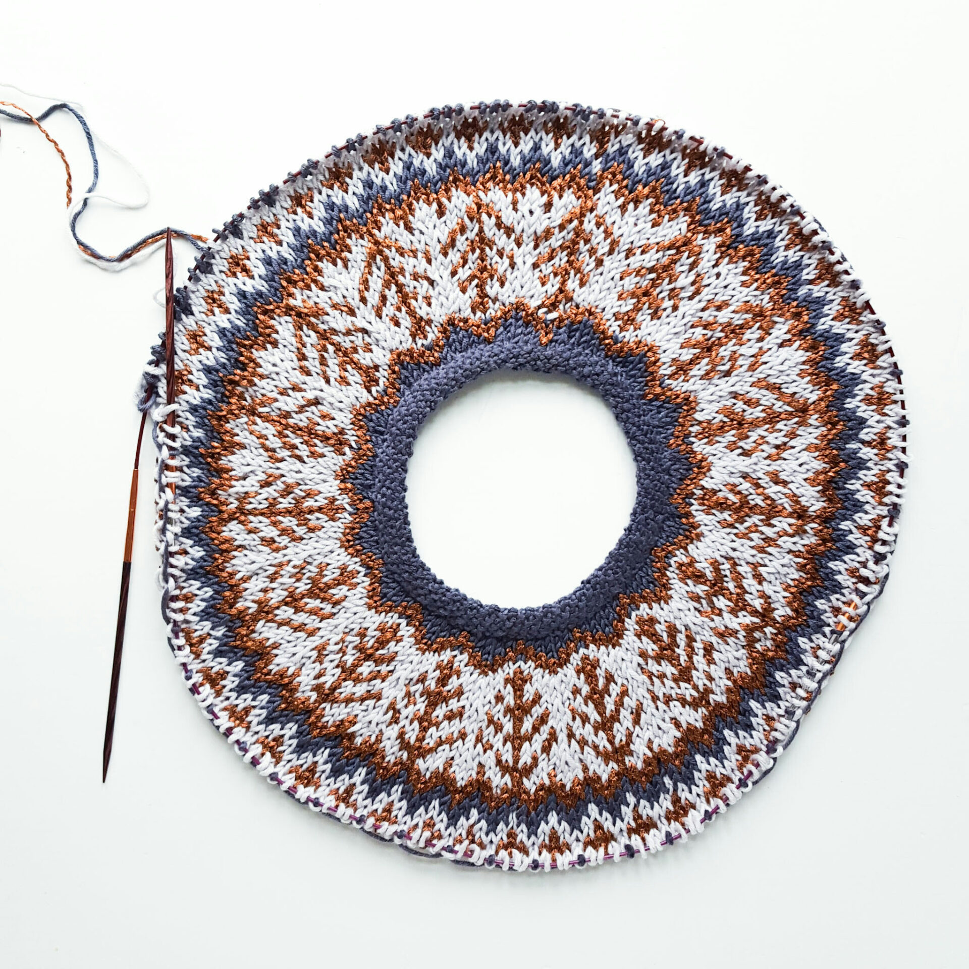 Modellen er konstrueret med en dekorativ halskant i perlestrik, som strikkes sammen med opslagskanten, hvilket giver et pænt og professionelt finish. Efter halskanten begynder mønsterstrik i tre farver, som udvikler sig i takt med udtagninger og tilføjer karakter til tunikaens bærestykke. Når arbejdet er langt nok, deles der til krop og ærmer, og kroppen formes med regelmæssige udtagninger i siderne, hvilket giver tunikaen sin karakteristiske A-facon.