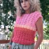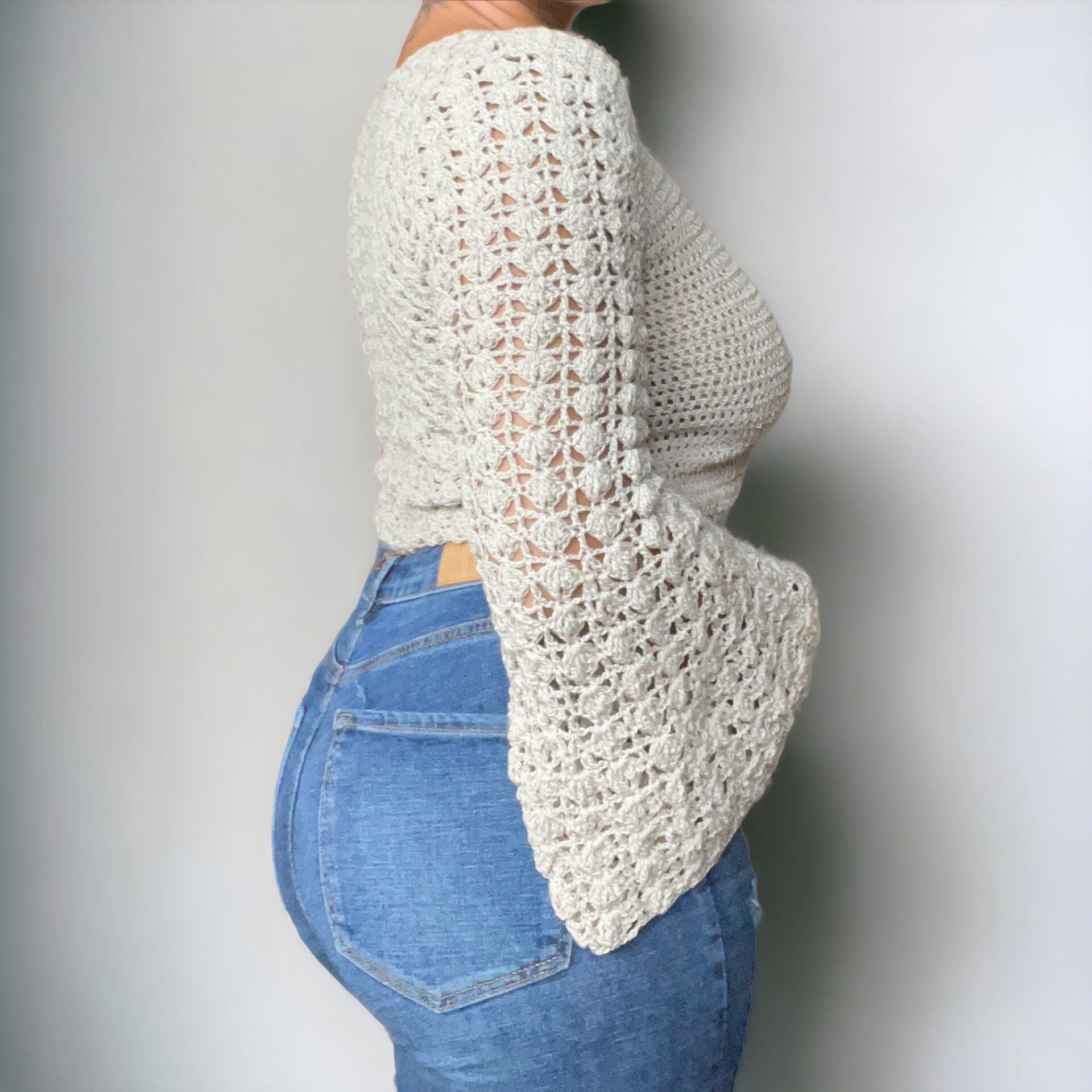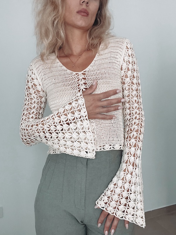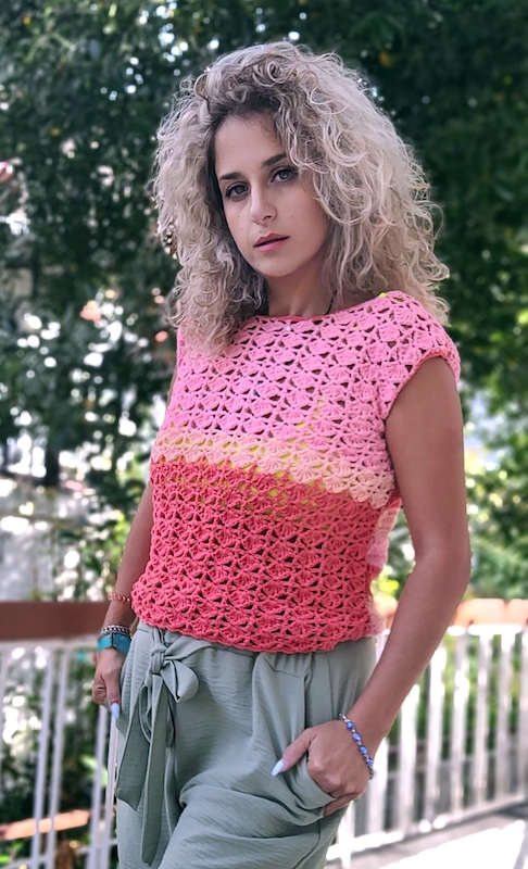Toppen er konstrueret i to dele – for- og bagstykke – og samles med kædemasker. Ærmerne, som er valgfrie, tilføjes til sidst og kan justeres i både længde og vidde. Ærmegabene afsluttes med fastmasker for en glat finish.