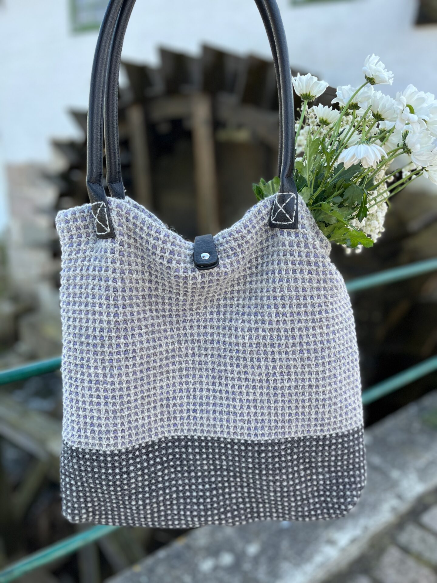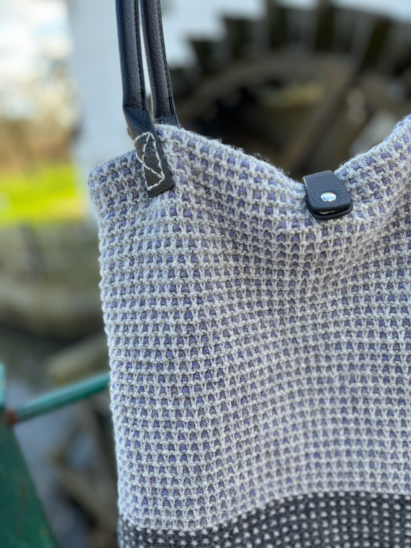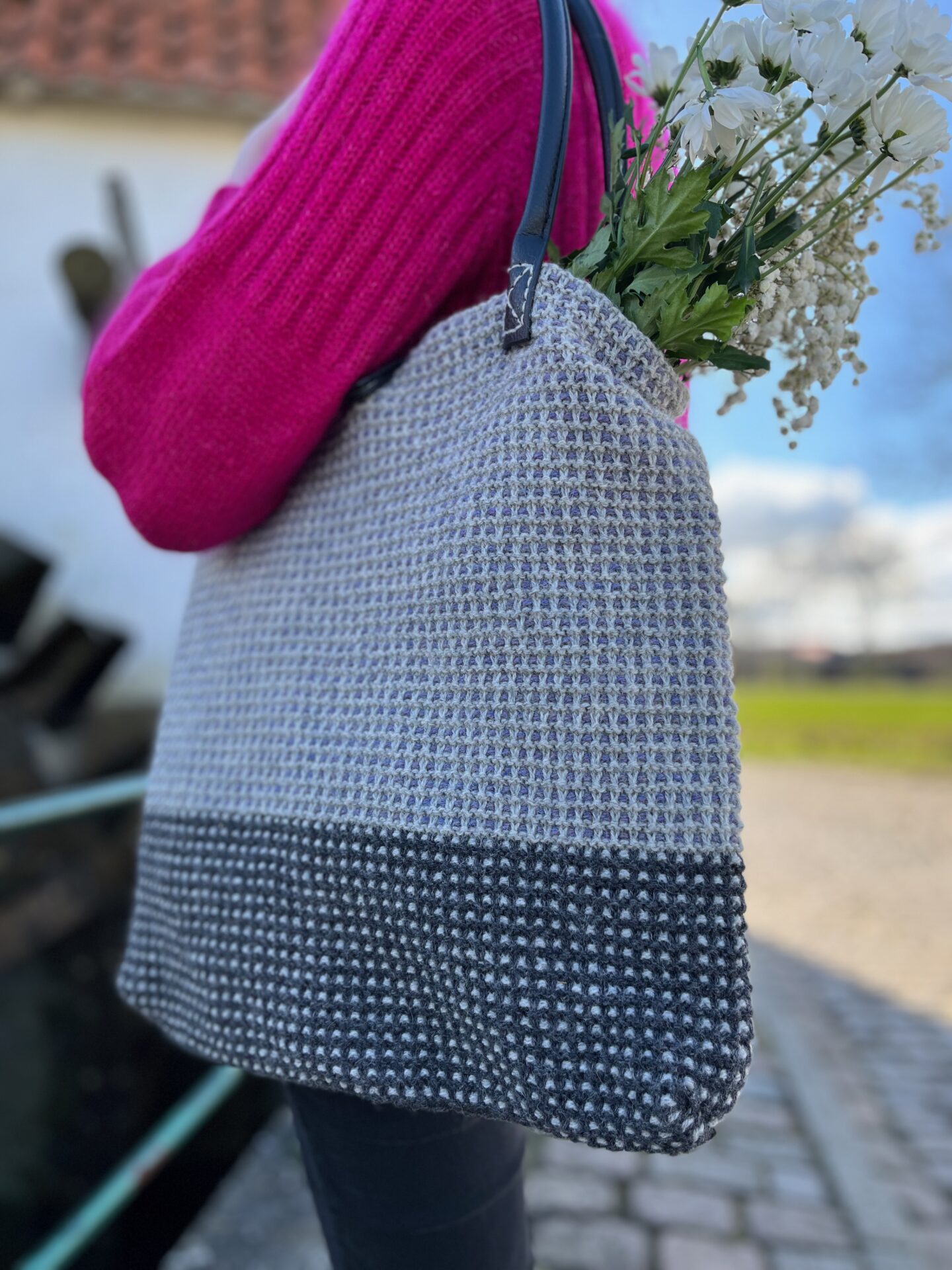 Vævestrikmønsteret giver tasken et rustikt og karakterfuldt look, og den strikkes med to farver ad gangen: først farve 1 og 2 på nederste del og derefter farve 2 og 3 på den øverste del.