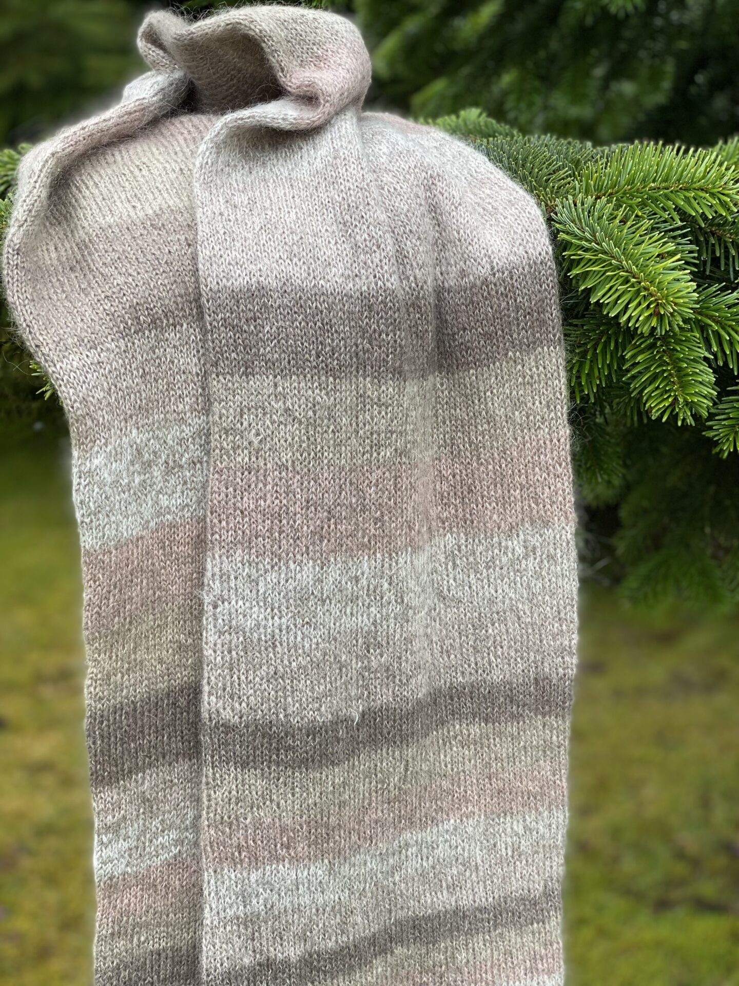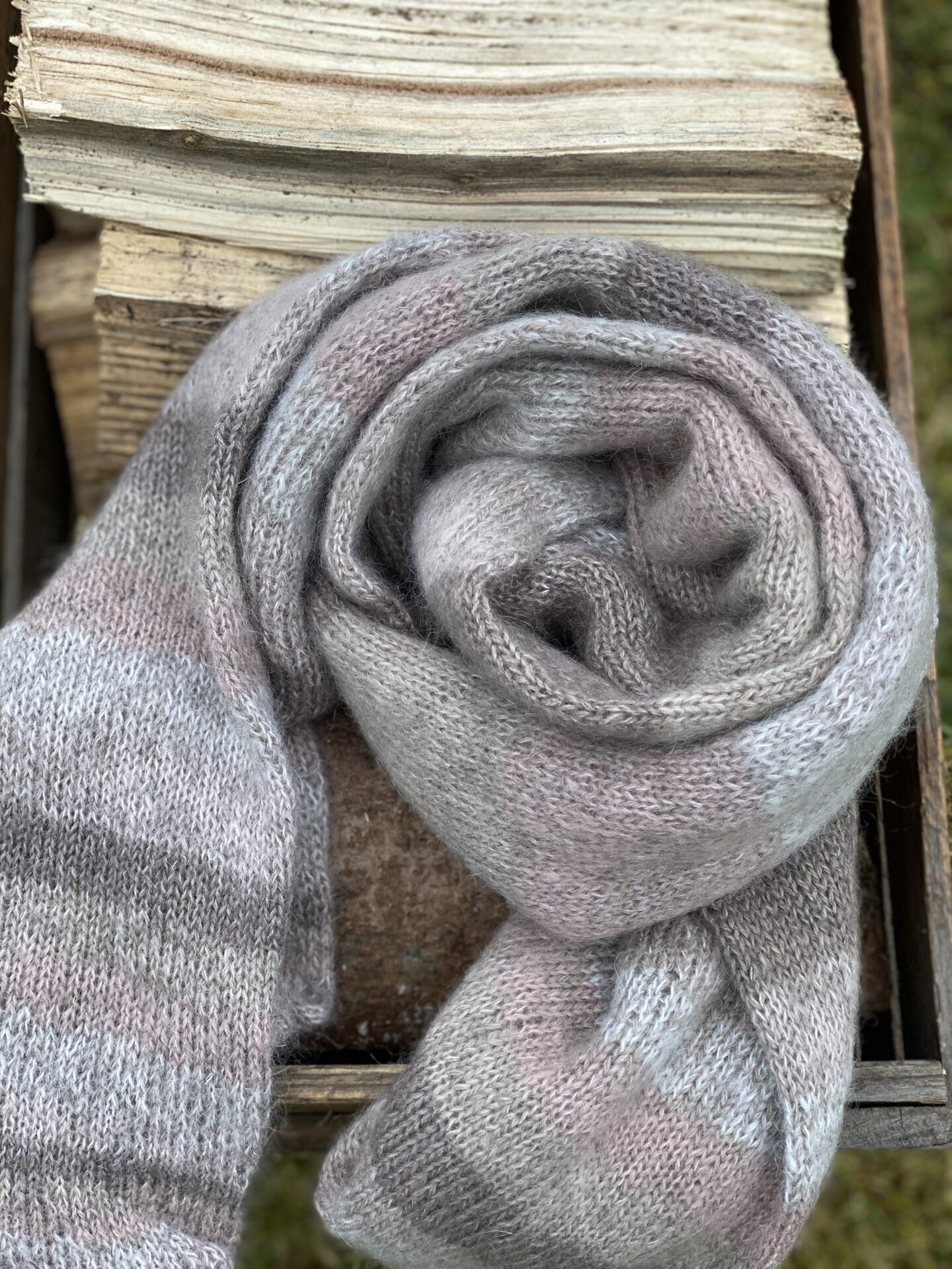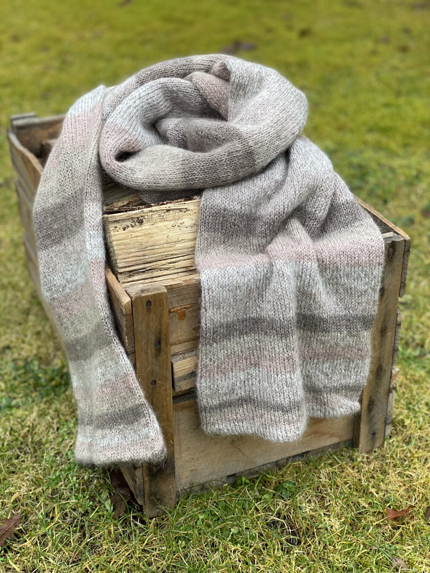 Fibonacci Scarf Stripes af BelongsToMyMom er et dobbeltstrikket tørklæde med striber. Et let og lunt tørklæde strikket på pind 4 mm i to tråde.