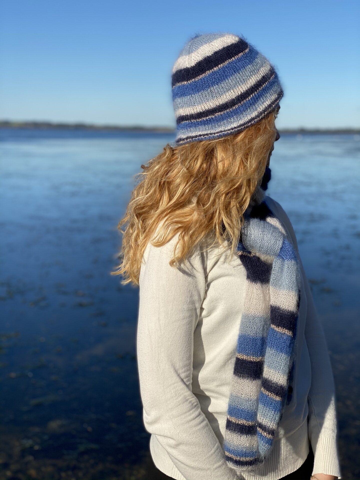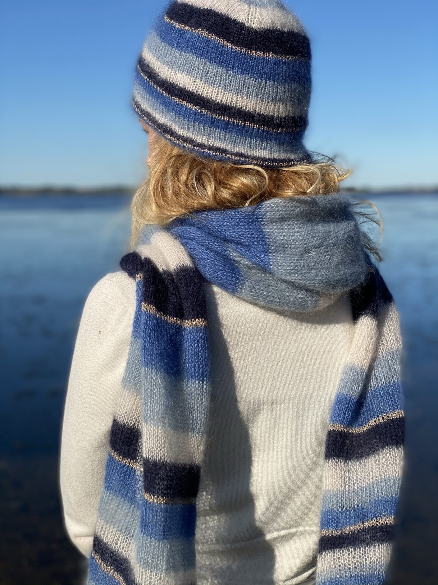 Fibonacci Winter Matching Set af BelongsToMyMom består af en hue og et tørklæde. Huen er strikket i 2 tråde mohair på pind 3,5 mm og tørklædet i 1 tråd mohair på pind 4 mm.