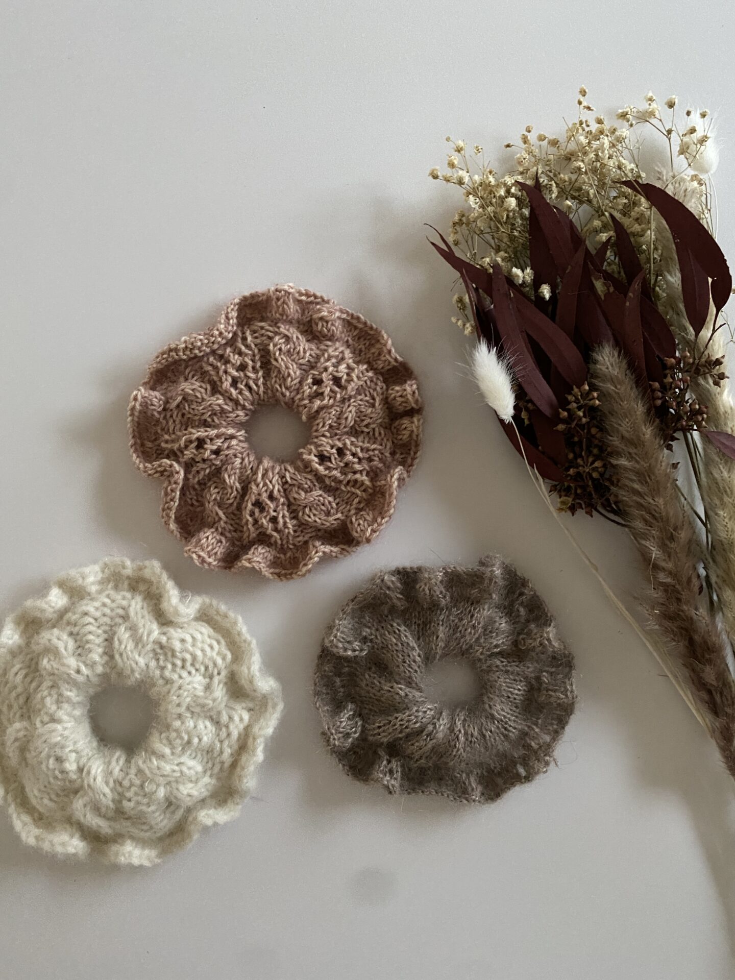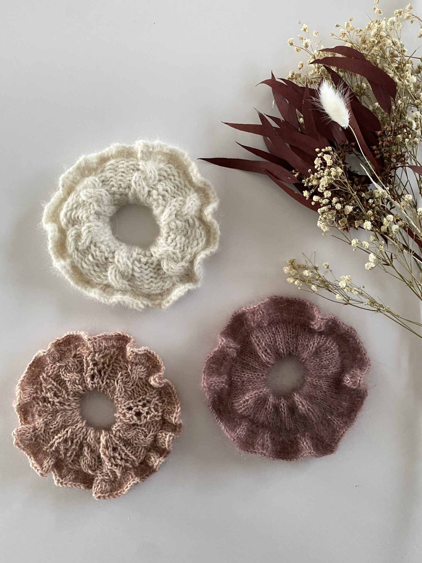 Flæsescrunchies fra Kracun Knitwear er de fineste håndlavede strikkede scrunchies – ideelle til enhver anledning. De kan strikkes i din yndlingsfarve, og de ser så fine ud i håret. Flæsescrunchies strikkes på en 3.50 mm pind.