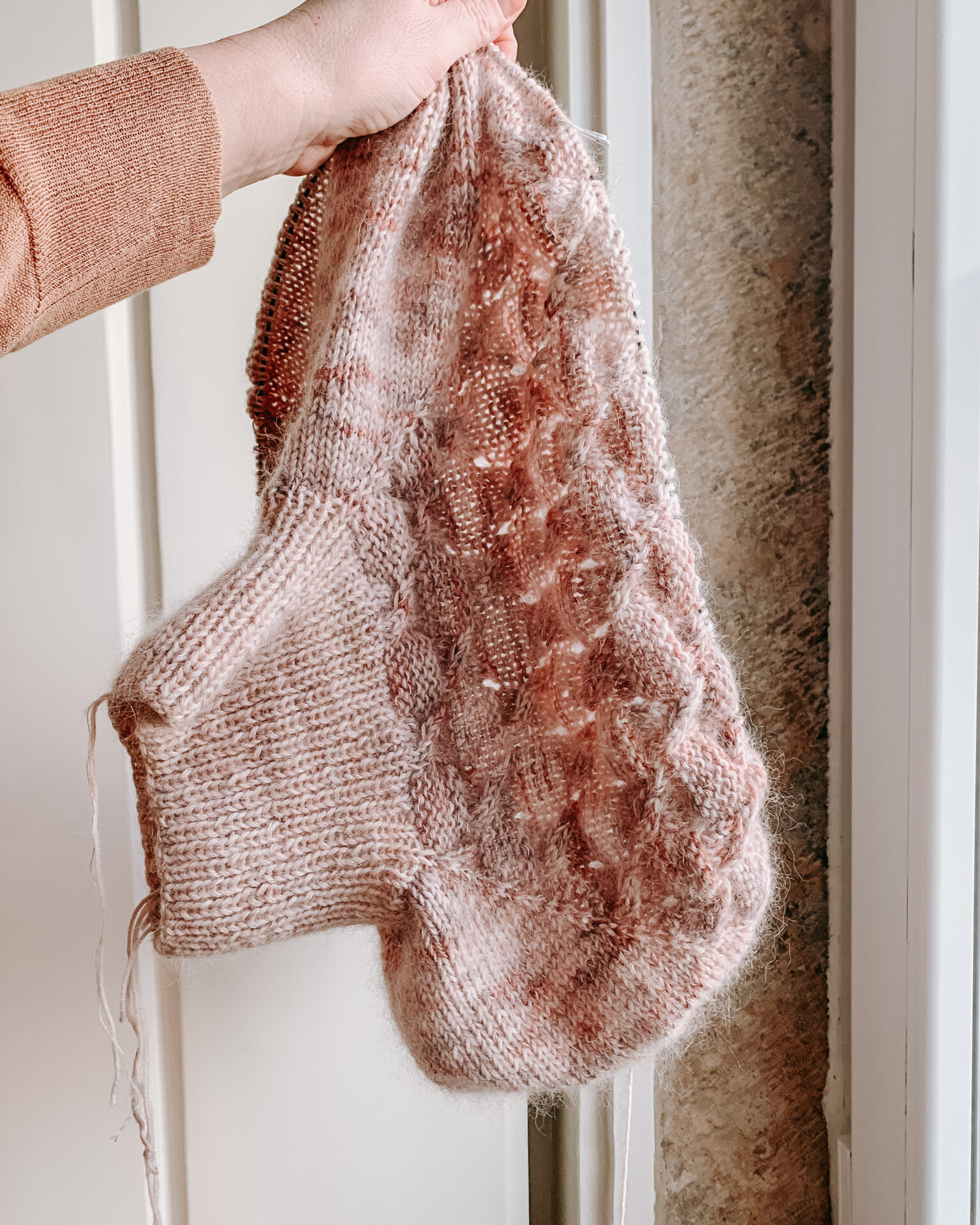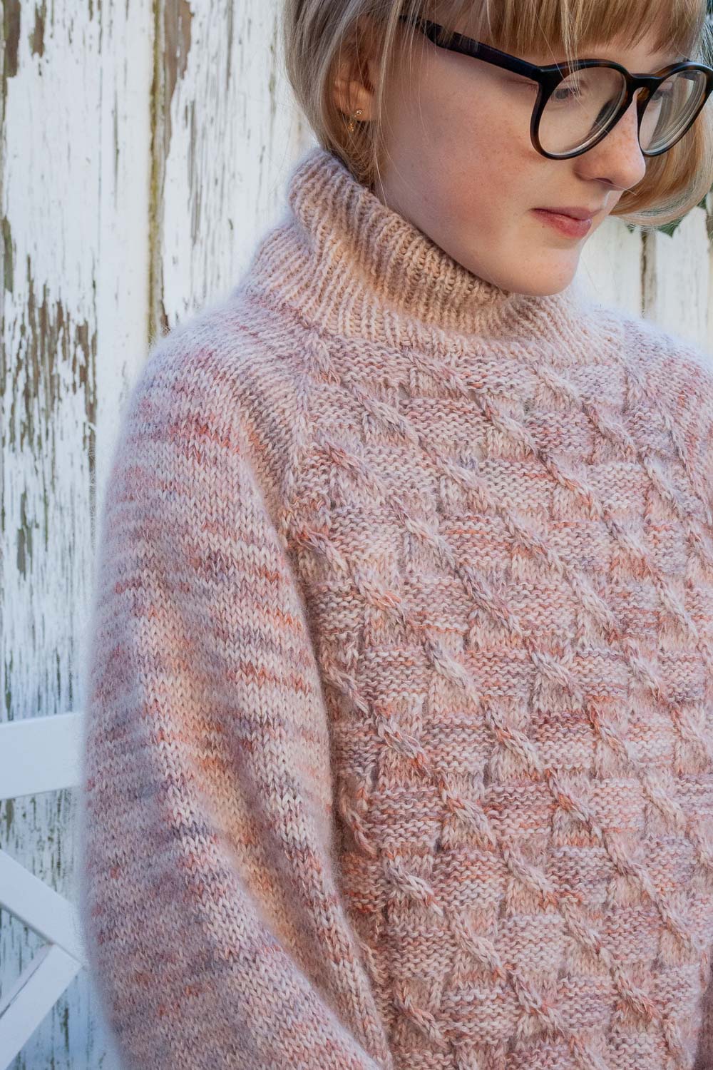 Der anvendes rundpinde 3,0 mm og 4,0 mm (60-80 cm) samt strømpepinde 3,0 mm til ribkanterne. Strikkefastheden er 21 masker pr. 10 cm i glatstrik på pind 4 med en tråd af hvert garn. Trøjen starter med en italiensk opslagning og formes med raglanudtagninger og fletmønster efter diagram. Fletmønsteret er levende og skifter løbende karakter, hvilket gør strikkeprocessen spændende og engagerende.