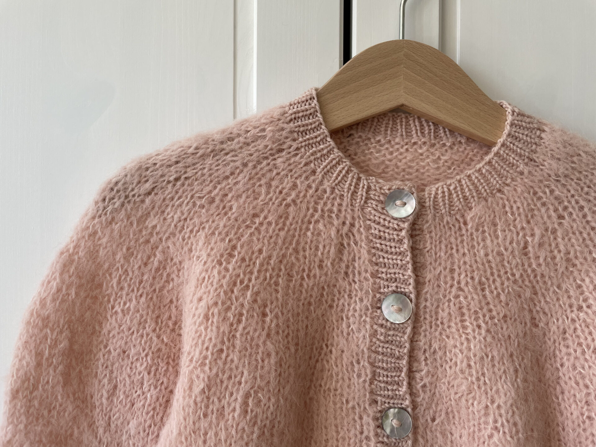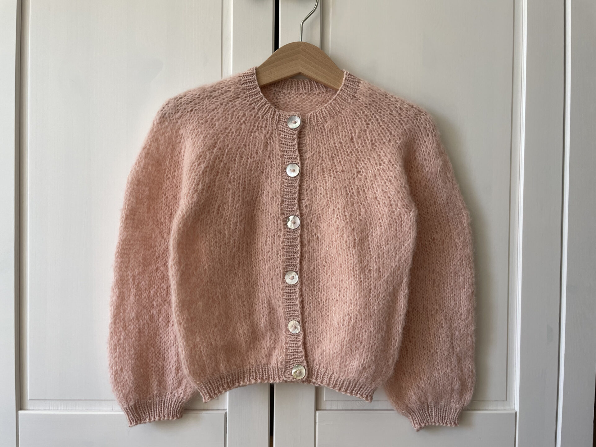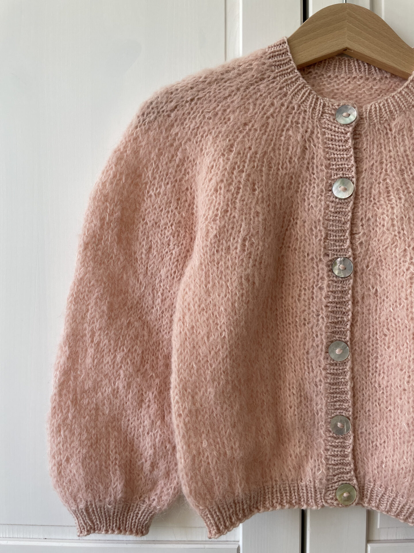 Florlet Cardigan af STRIKOGKAFFE er en lun og let sag strikket på pind 5 mm oppefra og ned. Cardiganen er strikket i et fluffy garn, f.eks. alpaka, og et merino/uld-garn til ribkanterne.