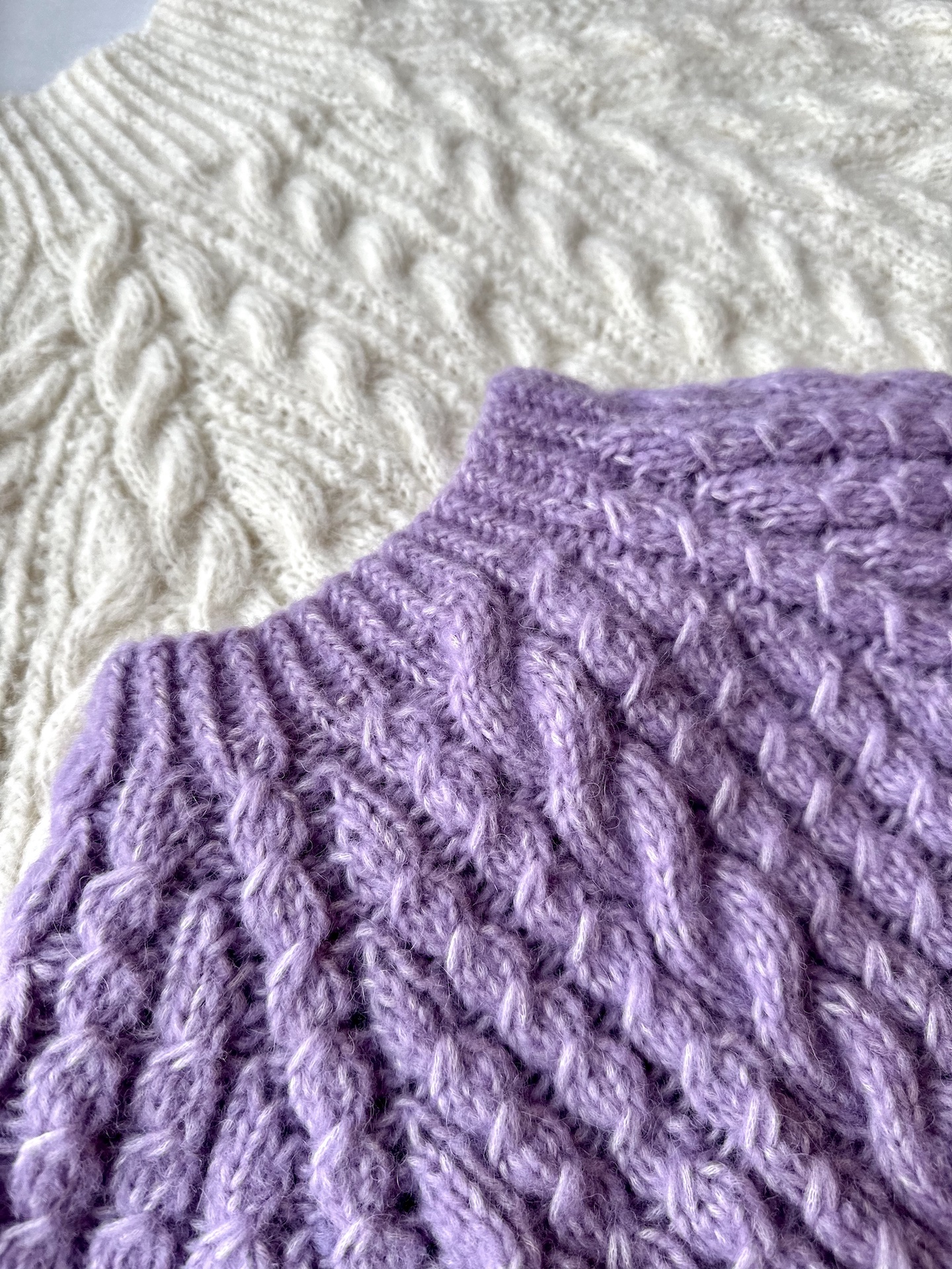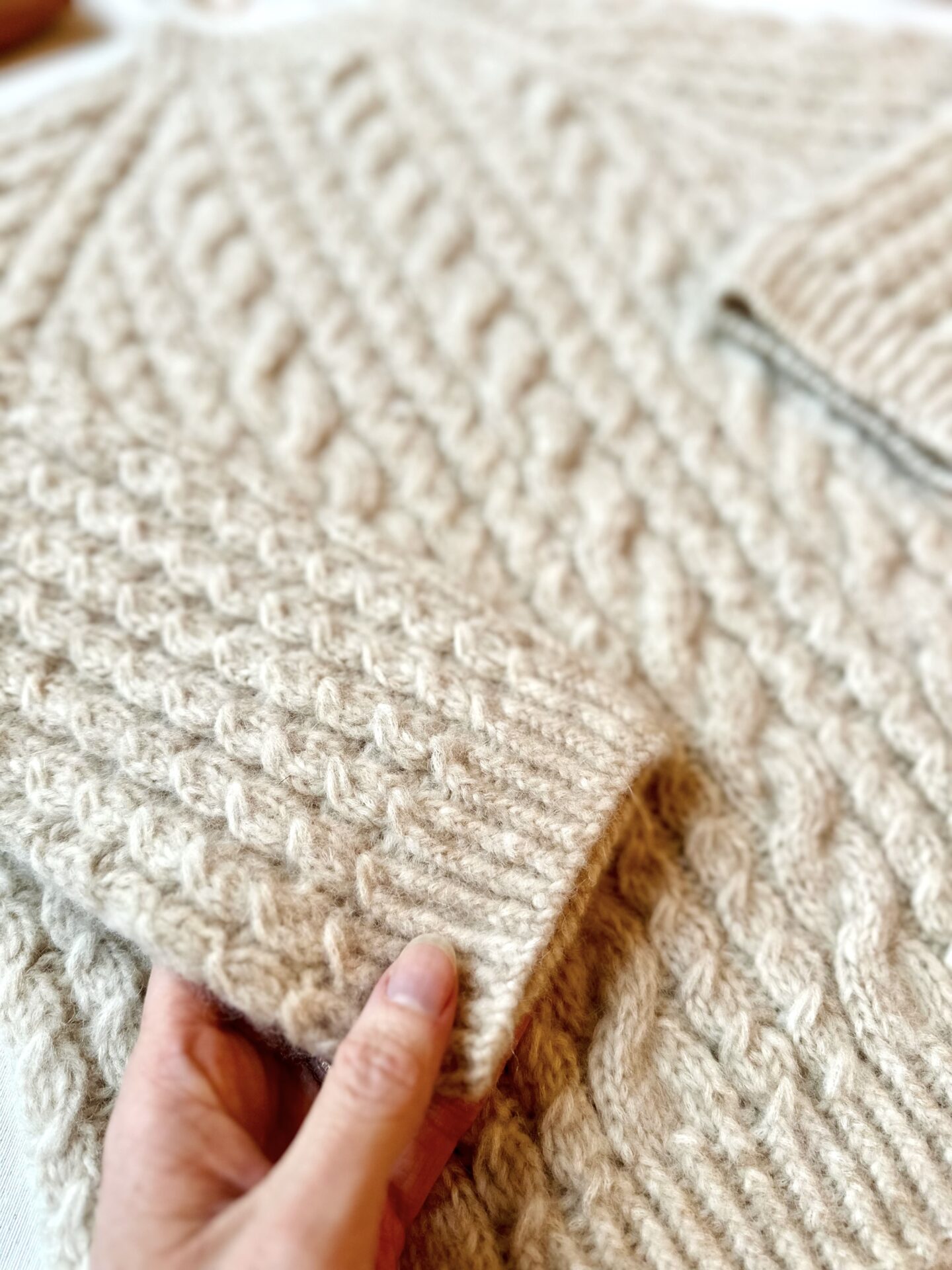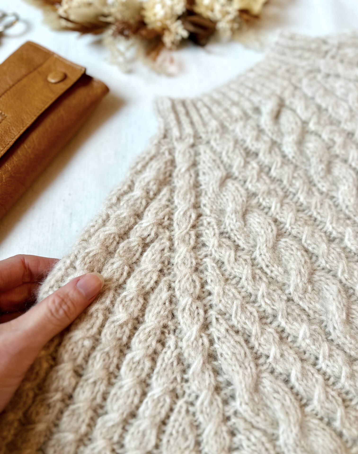 Sweateren strikkes med en strikkefasthed på 20 masker og 22 pinde pr. 10 x 10 cm i kabelmønster efter blokning, på rundpinde 4 og 5 mm. Strømpepinde eller korte rundpinde kan bruges til ærmerne.