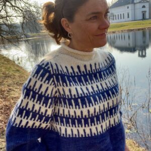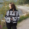 This sweater is both crocheted and knitted using double strands of yarn for added volume and warmth. The recommended yarn is Ingenua by Katia – a luxurious blend of 78% mohair, 13% polyamide, and 9% wool. The yarn comes in 50 g balls with a length of 140 meters. A total of 600 g of yarn is used for the sweater, divided into the following colors: black (300 g), white (200 g), and grey (100 g). The fluffy mohair blend gives the sweater a soft, voluminous feel while remaining lightweight and comfortable to wear.