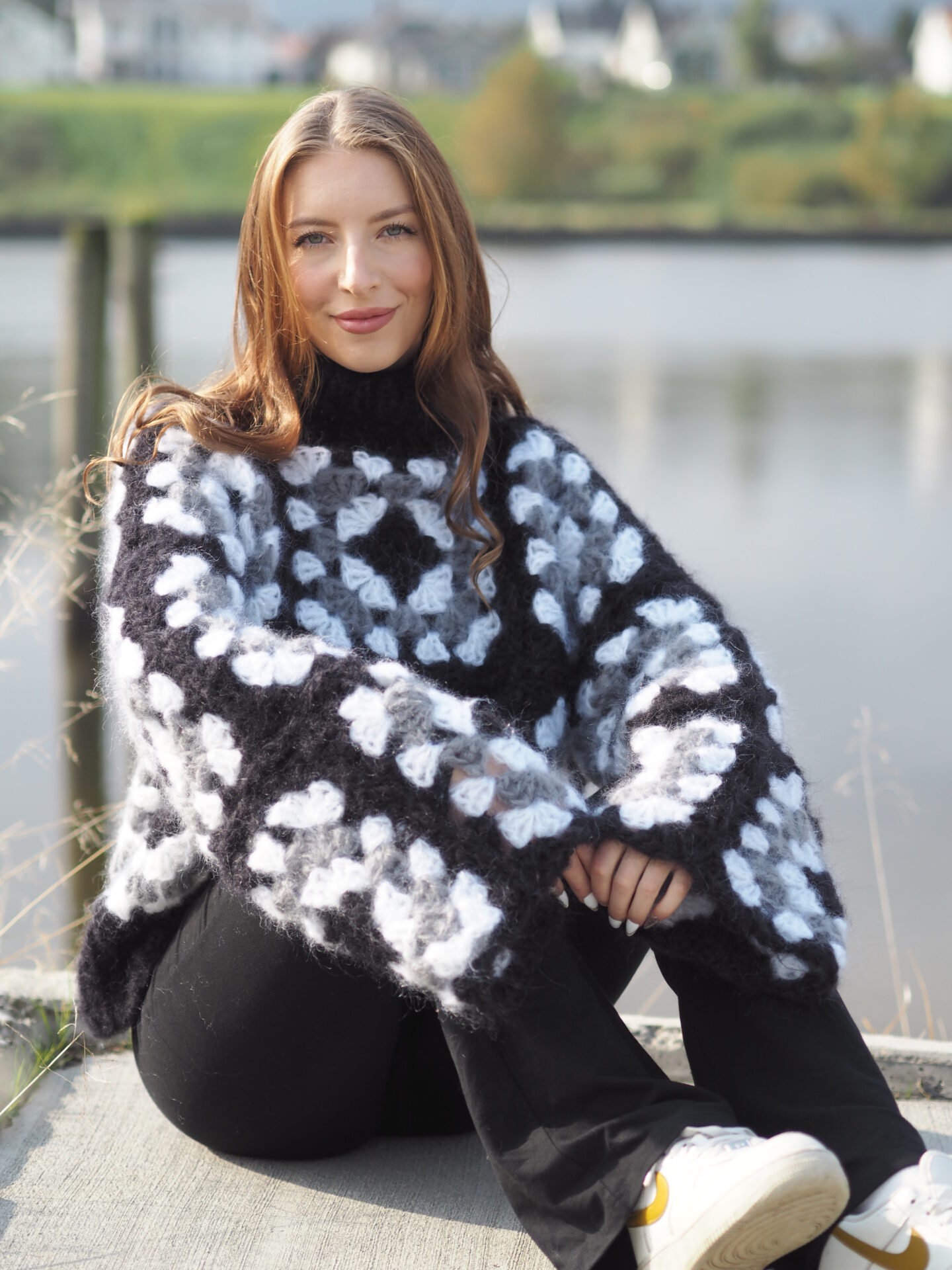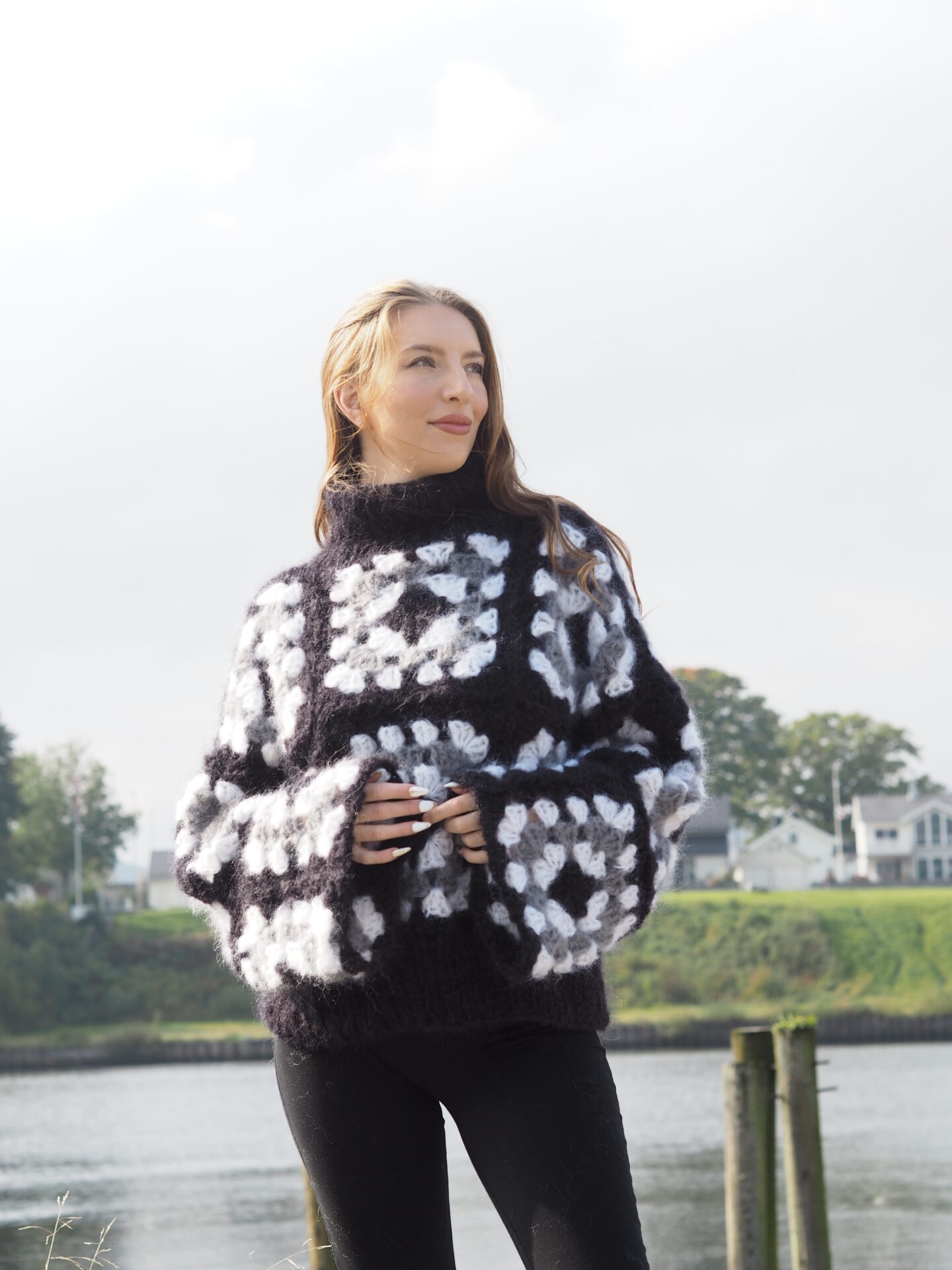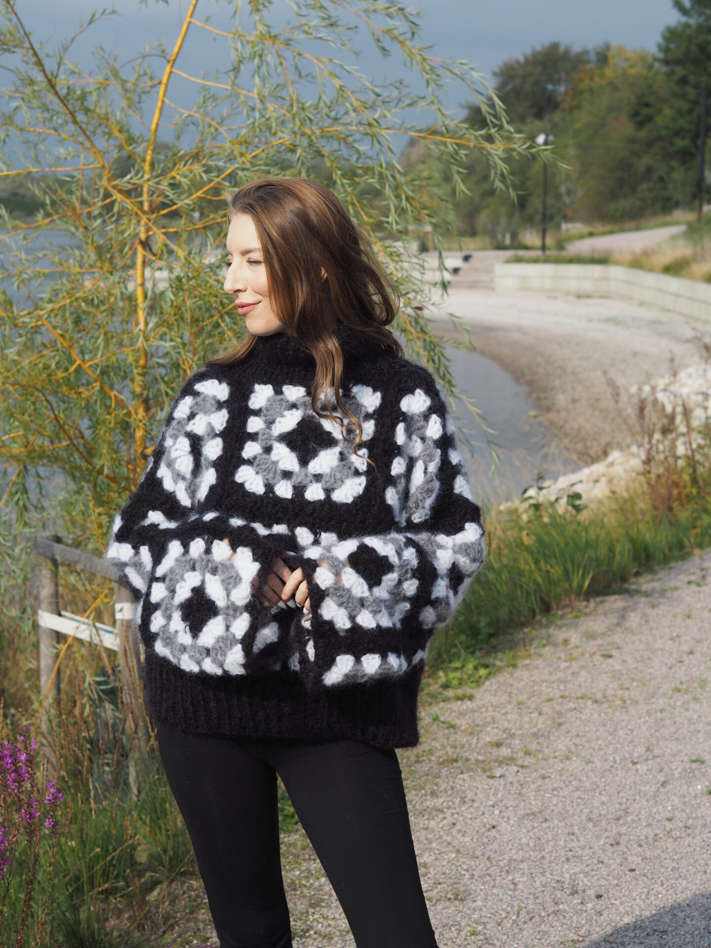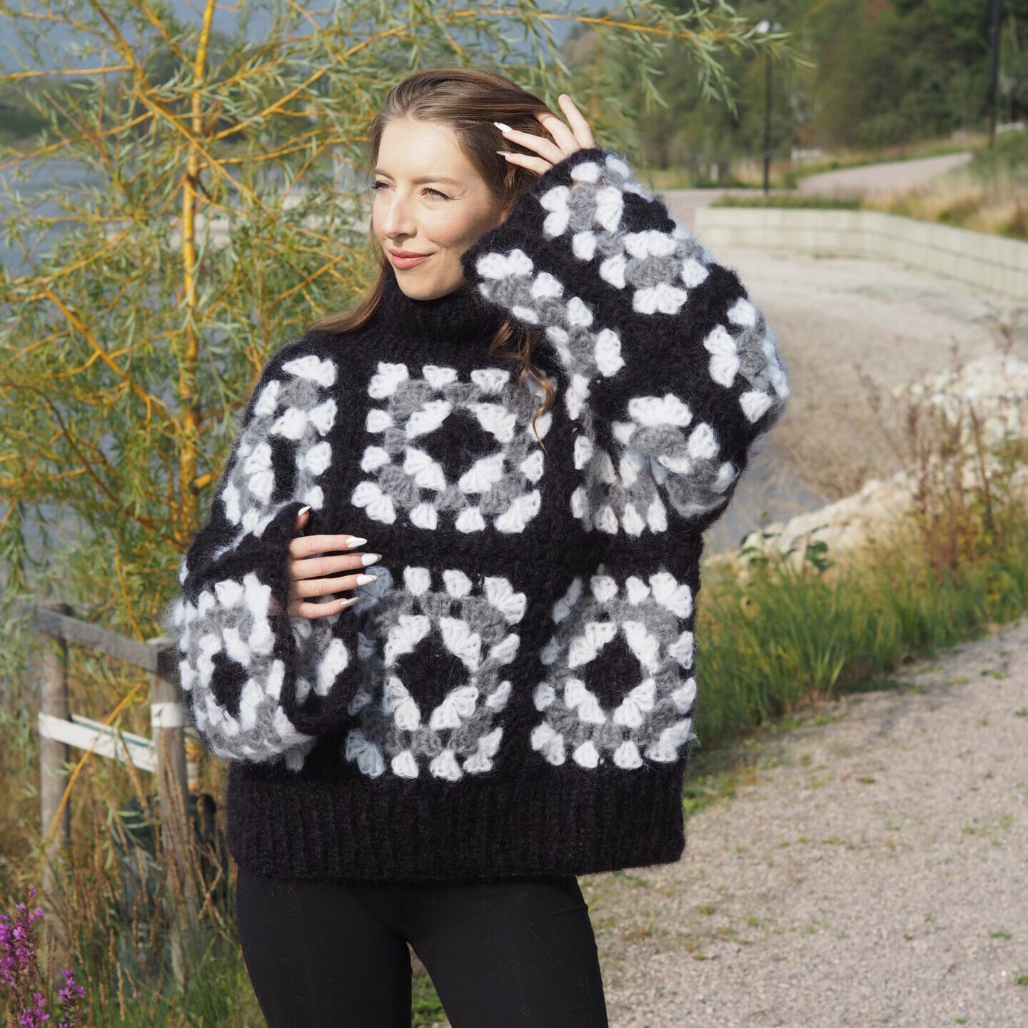 Each granny square is worked over 5 rounds and measures approx. 22 x 22 cm. The colors alternate between black, white, and grey, arranged in a way that adds depth and contrast to the finished piece. The squares are joined to create the front and back panels as well as the sleeves, which are then assembled to complete the sweater. The neck and bottom edges are finished with ribbing for a neat and comfortable fit.