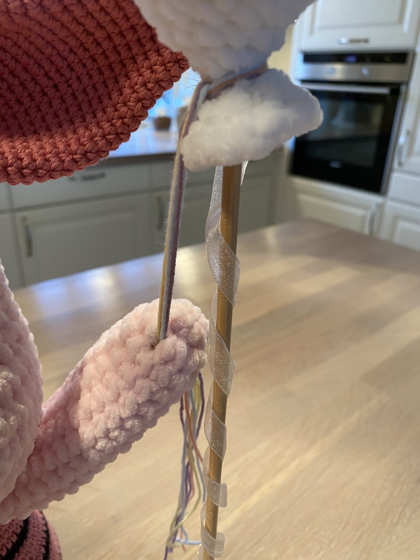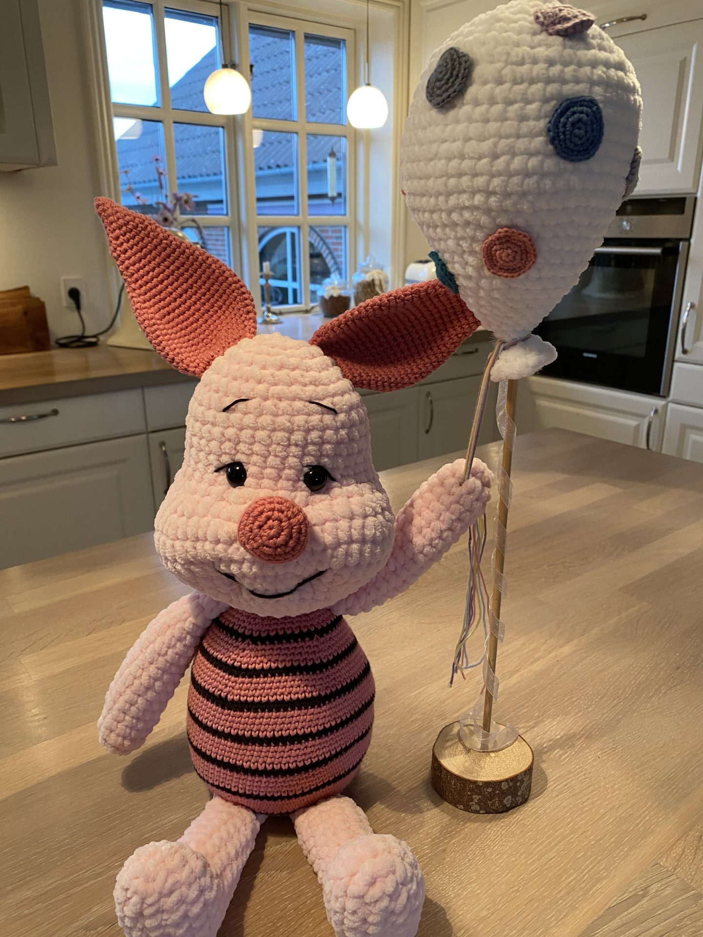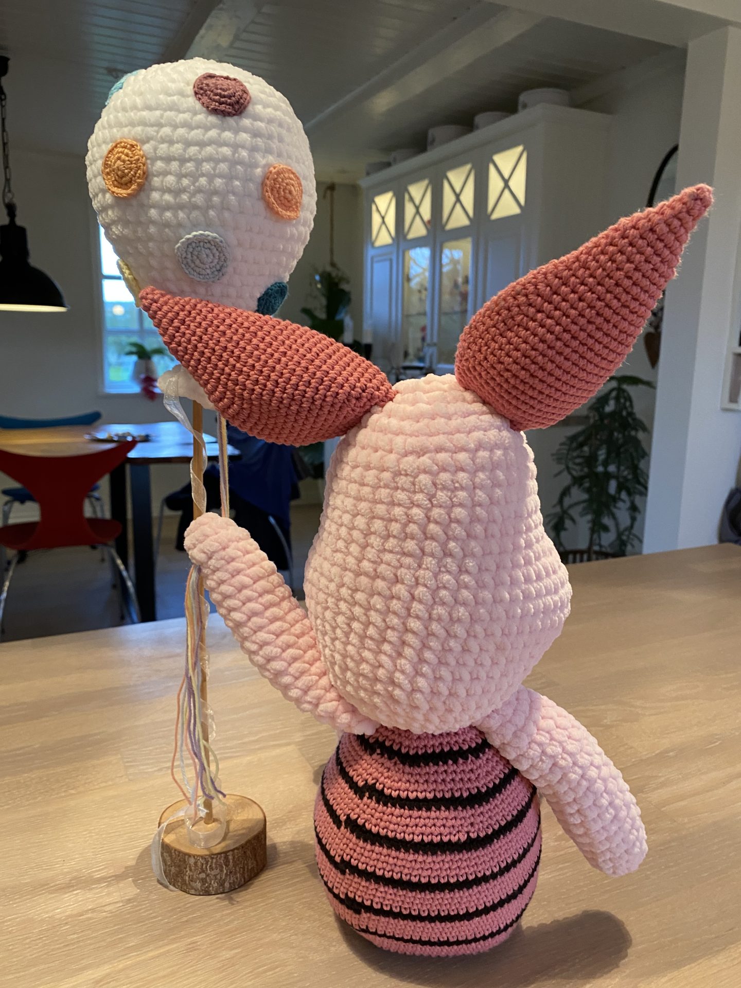 Grisling måler ca. 30 cm. siddende med ekstra 12 cm i ørene, så 42 cm i alt. Her hæklet med en prikket ballon, perfekt til lejligheder og/eller gaver.