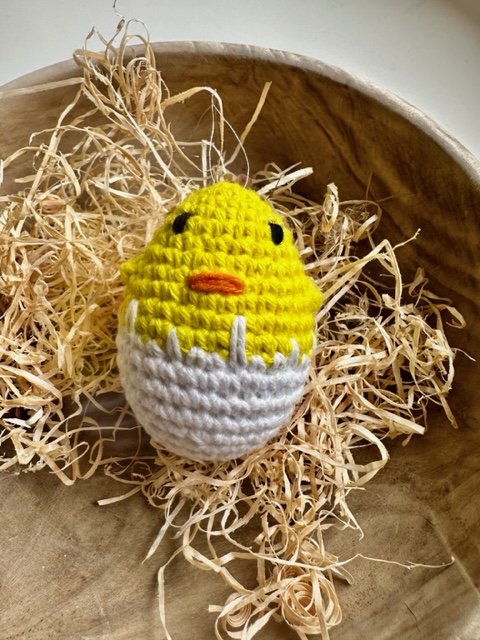 Hækl en sød påskekylling i æggeskal med denne nemme opskrift – perfekt som dekoration eller gave. Brug bomuldsgarn 4/8 og hæklenål 2,5 mm.