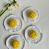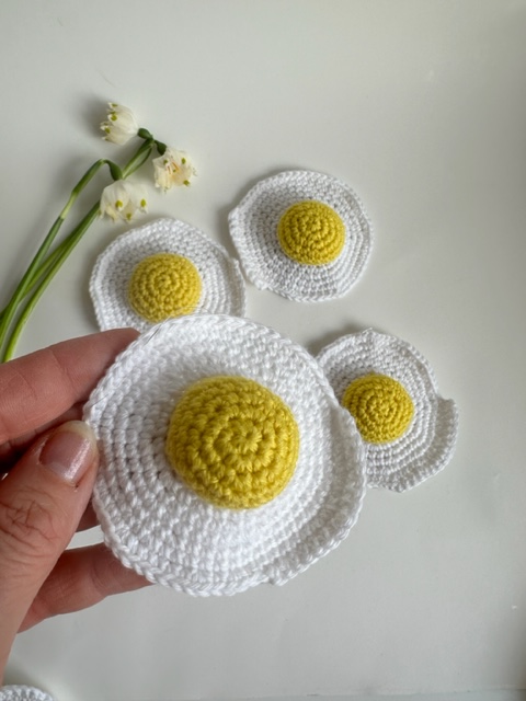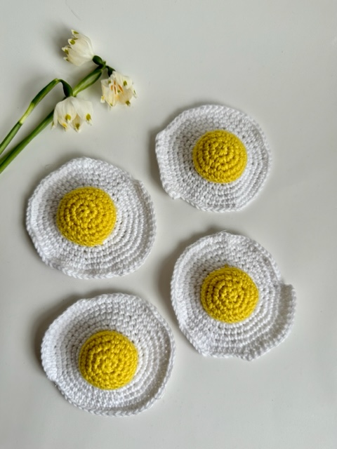Sød opskrift på hæklet spejlæg – perfekt som påskepynt eller til legekøkkenet. Hækles i bomuldsgarn med nål 2,5 mm og måler ca. 9 cm.