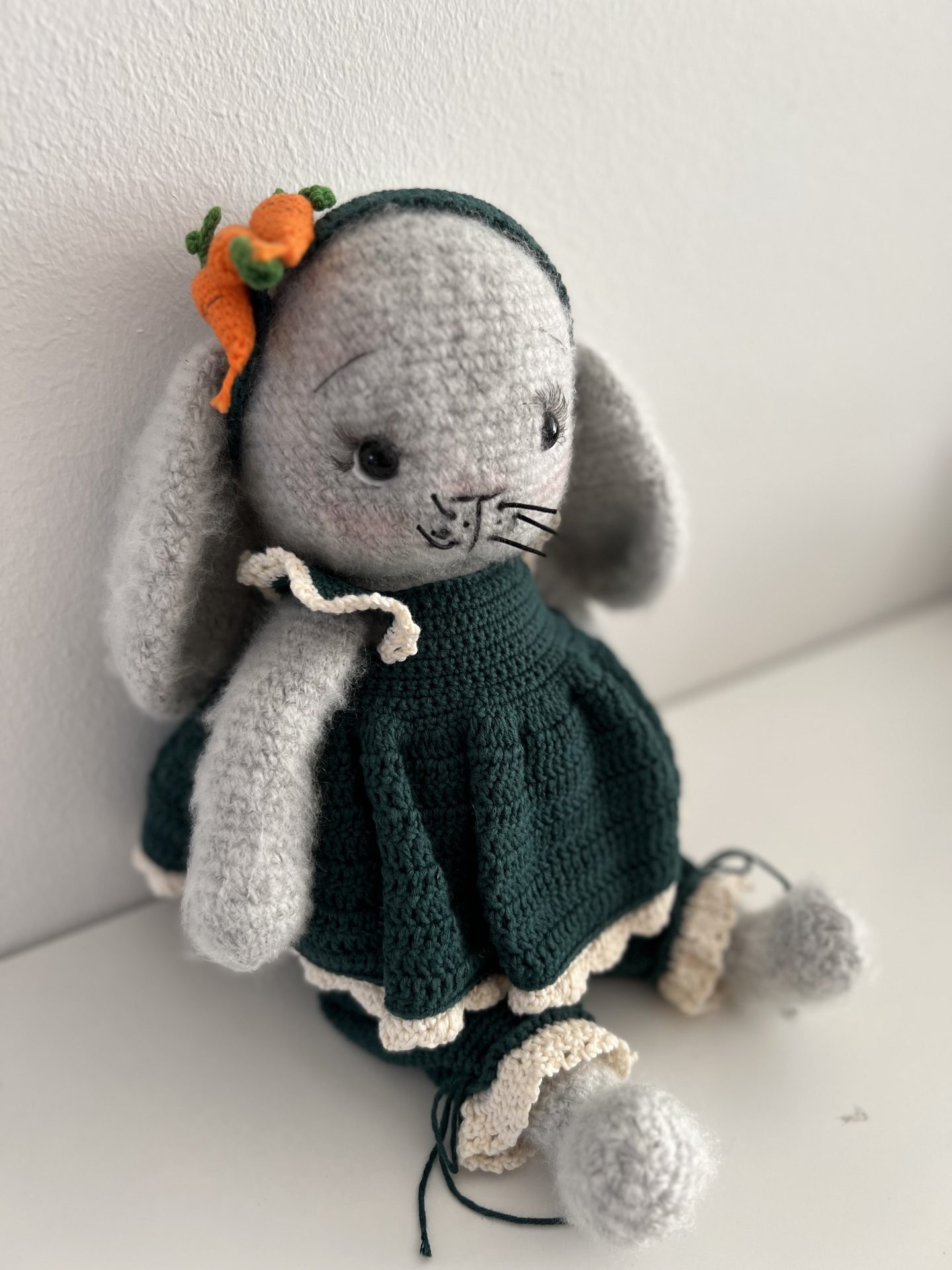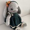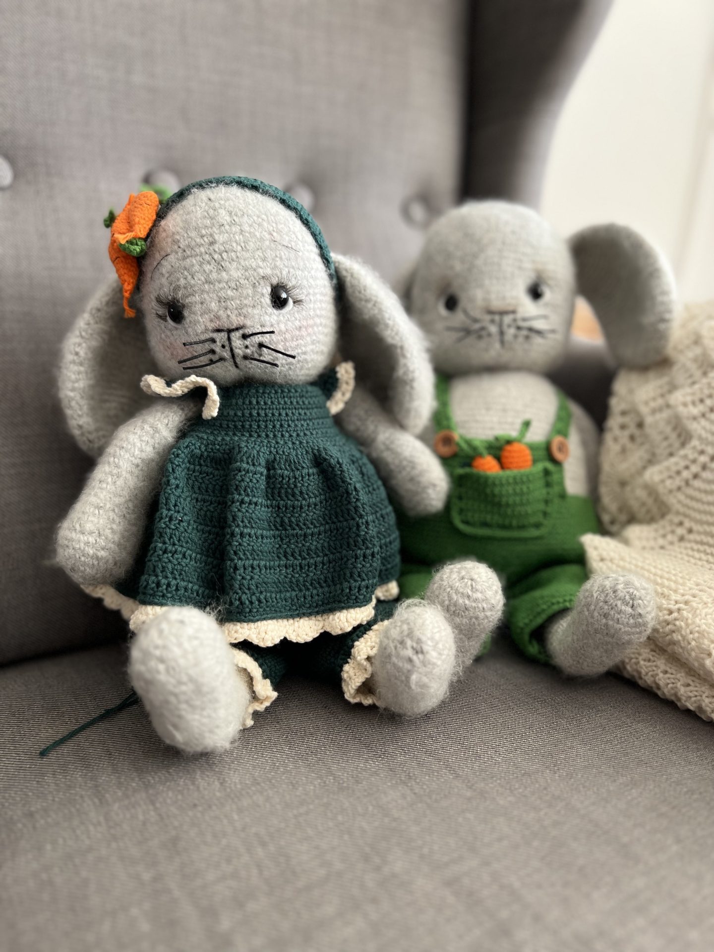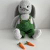 Opskriften anvender primært Bumbo Puffy fra Mayflower i farve 06 (grå) til hoved, krop, ører, arme, ben og fødder. Dertil bruges Infinity Hearts Rose 8/4 i tre farver: mørk grøn (fv. 241) til bl.a. Fias kjole og Hampus’ detaljer, græsgrøn (fv. 156) til bukser, seler og gulerodstoppe, samt råhvid (fv. 172) til blonder og knapdetaljer. Derudover skal du bruge lidt orange bomuldsgarn til gulerødder og sort garn til snuder og detaljer, samt hvide filtstykker og sikkerhedsøjne (12 mm).