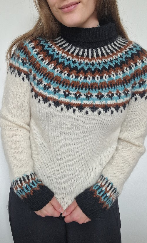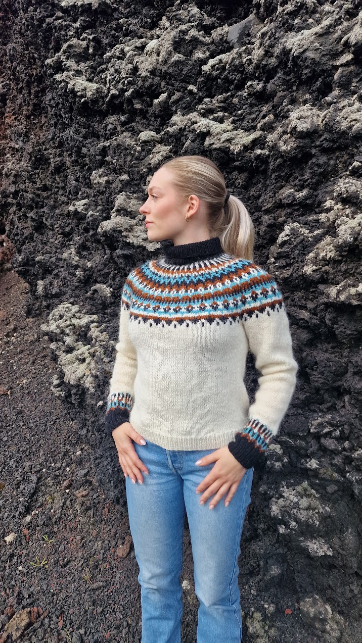 Hraunfossar Sweater is a beautiful Icelandic lopapeysa designed by Knitter from Iceland/Lopamunstur. This timeless design is inspired by the flowing lava falls in Iceland and features striking colorwork that brings out the natural contrast of the yarn shades. The sweater is knitted in Istex Léttlopi, a classic Icelandic wool yarn known for its warmth, durability, and rustic texture. Léttlopi comes in 50 g skeins with a length of 100 meters, which equals a yardage of 100 meters per 50 grams. This yarn is ideal for creating a lightweight yet warm sweater suitable for layering in colder climates.