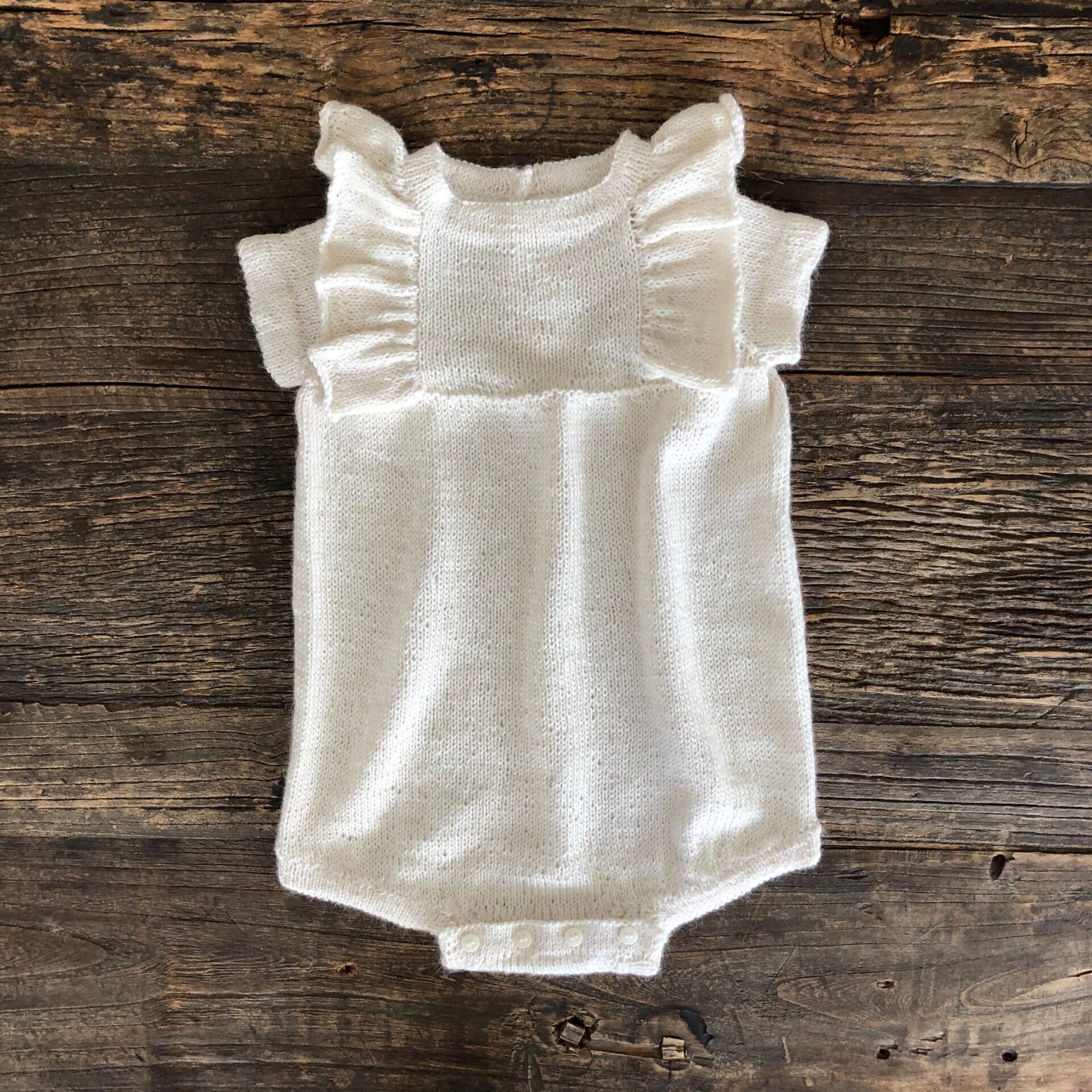 Ingrids Romper er en sød strikket romper til de helt små, fyldt med smukke detaljer på pind 2.5 og 3.0 mm.