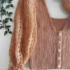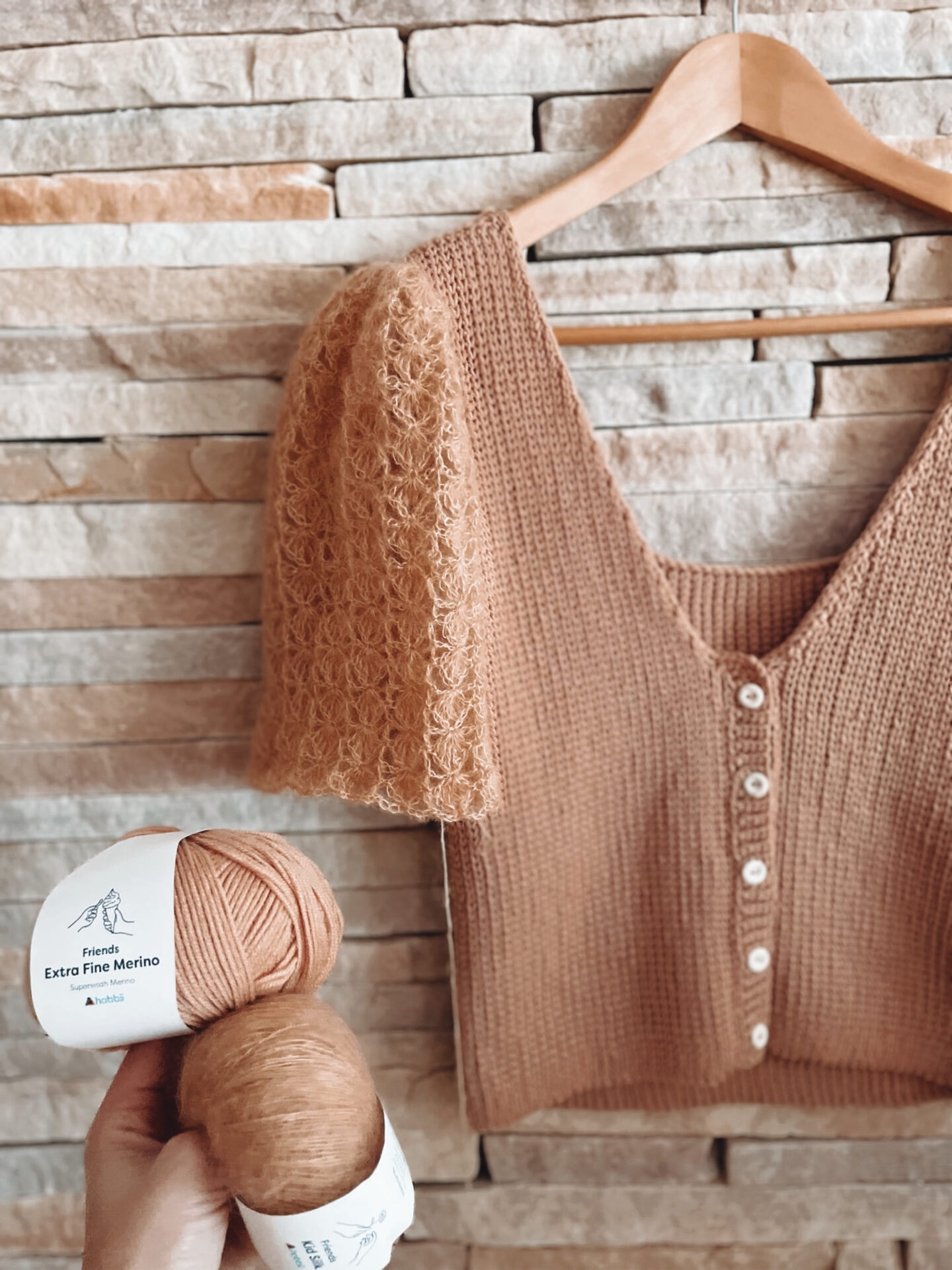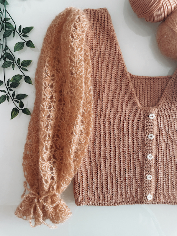 Toppen hækles med to typer garn: Friends Extra Fine Merino og Friends Kid Silk fra Hobbii. Til panelerne (krop og krave) bruges sport weight merinogarn, og til ærmerne anvendes let mohairgarn, som kan bruges enkelt- eller dobbelttrådet afhængig af ønsket struktur.